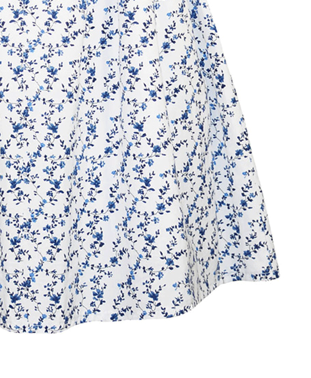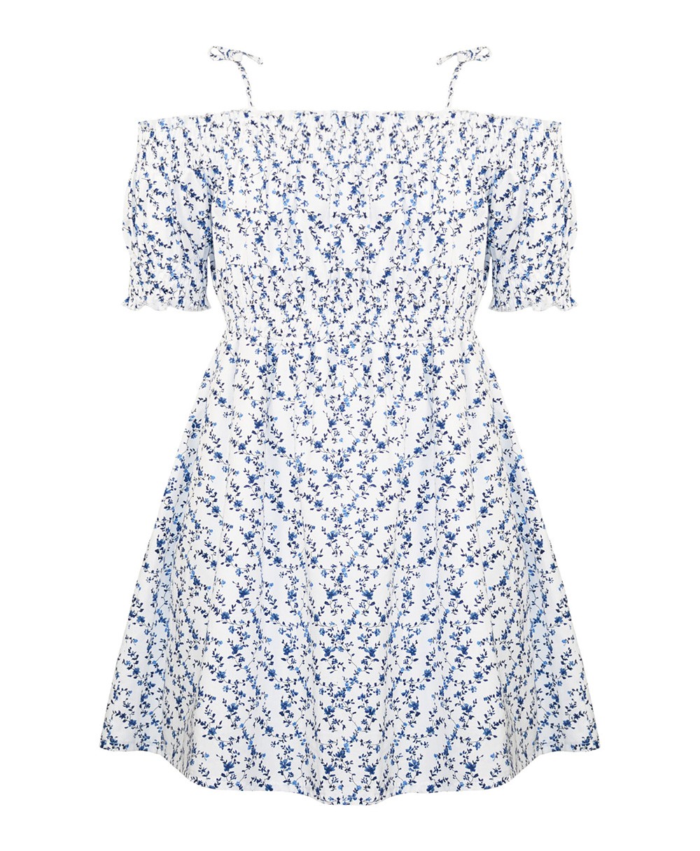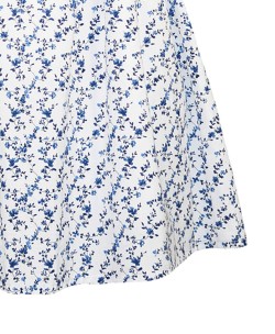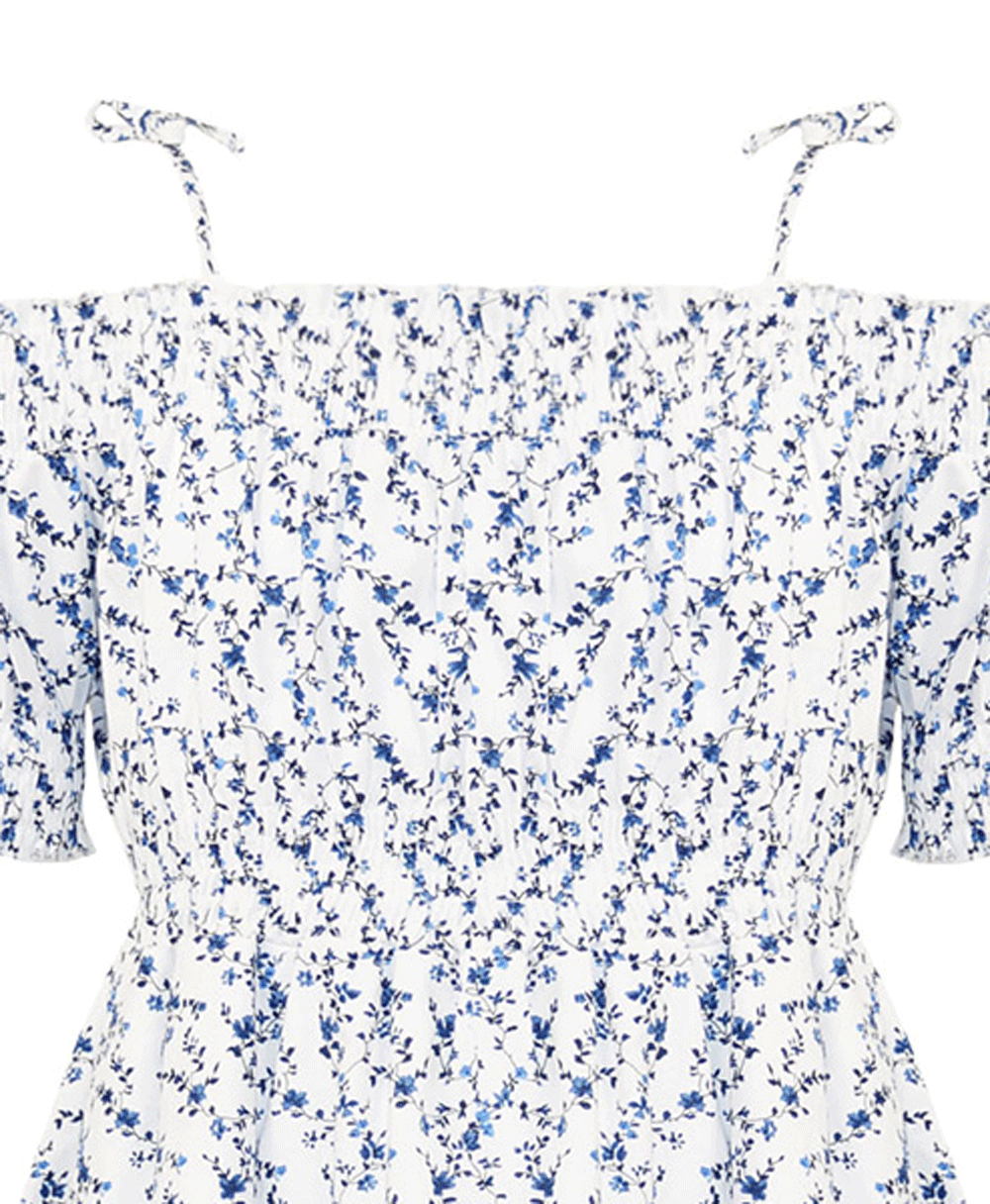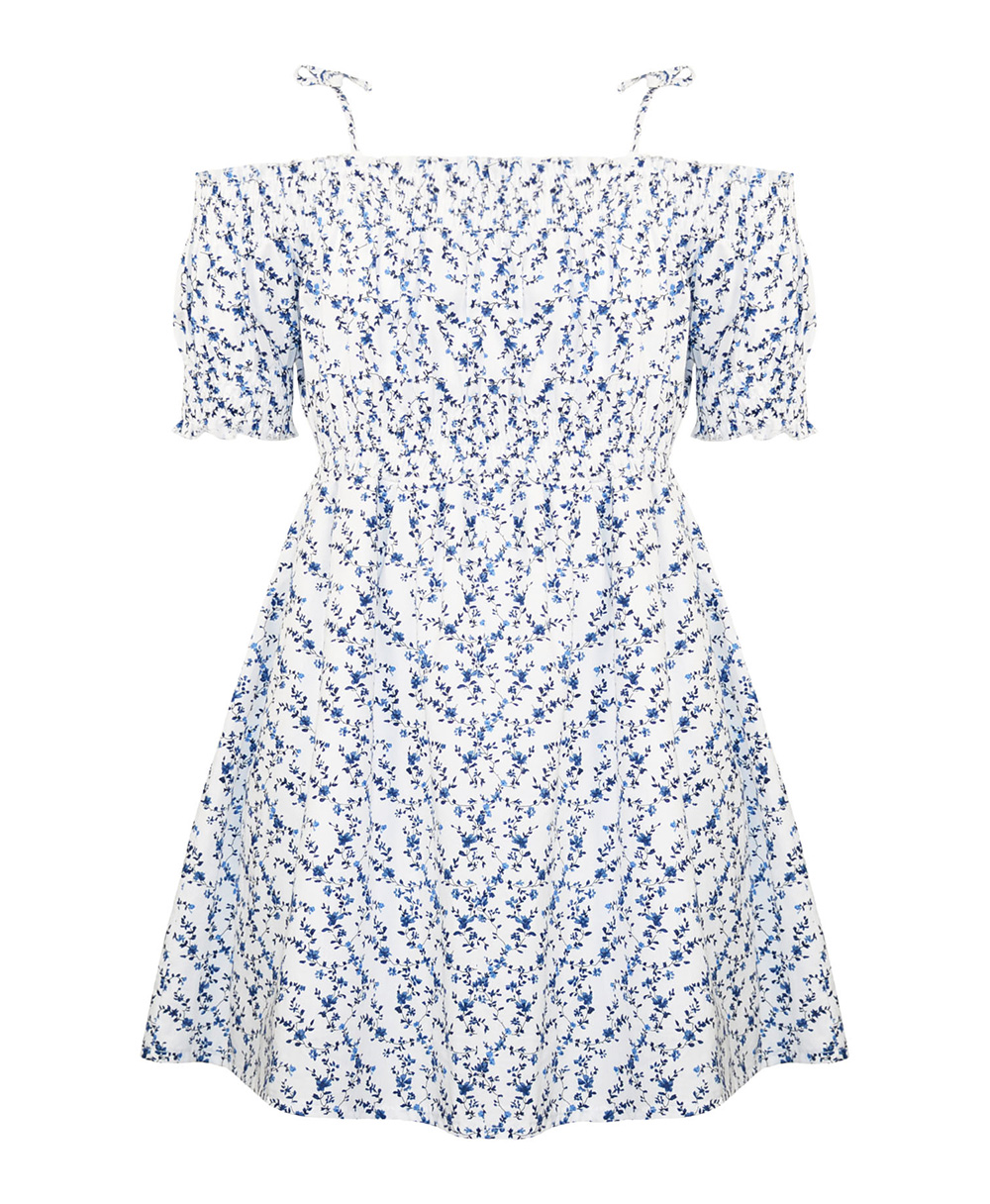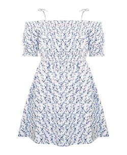 Φόρεμα κοντομάνικο σε λευκό χρώμα με σιέλ λουλούδια. Στους ώμους κατεβαίνει.