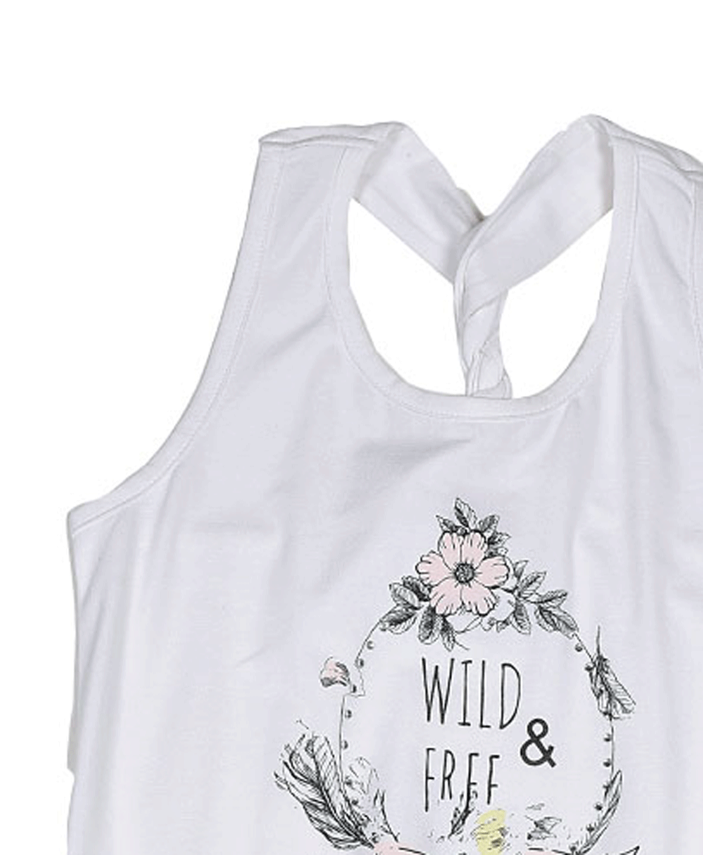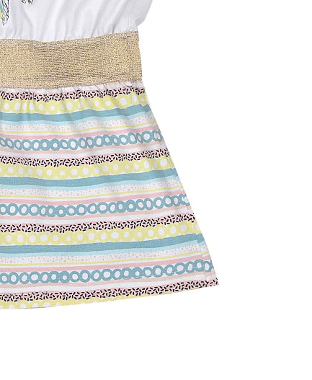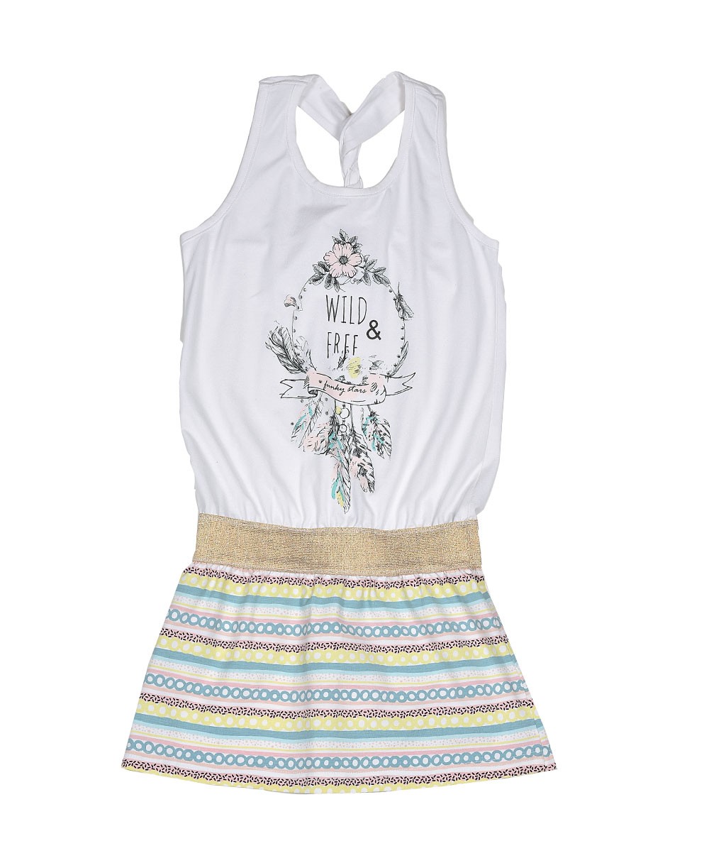 Φόρεμα αμάνικο λευκό το πάνω μέρος με σχέδιο και ριγέ το κάτω.