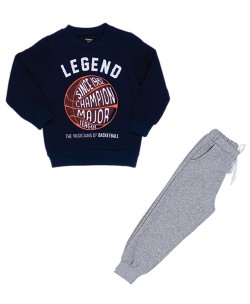 Φόρμα φούτερ που αποτελείται από 2 κομμάτια: πάνω μέρος μαύρη μπλούζα με σχέδιο μπροστά, κάτω μέρος γκρι παντελόνι.