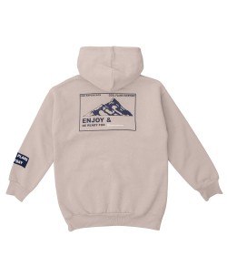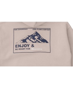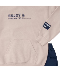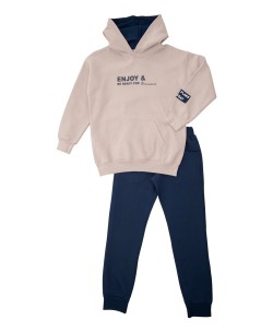 Φόρμα φούτερ που αποτελείται από 2 κομμάτια: πάνω μέρος μπεζ μπλούζα με κουκούλα και γράμματα μπροστά, κάτω μέρος μπλε παντελόνι.