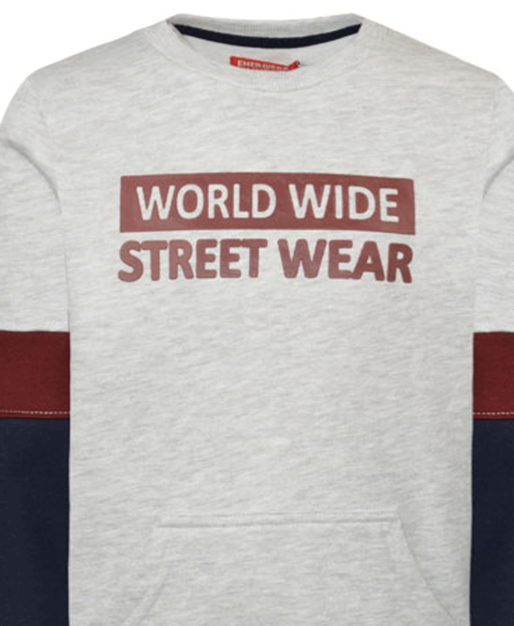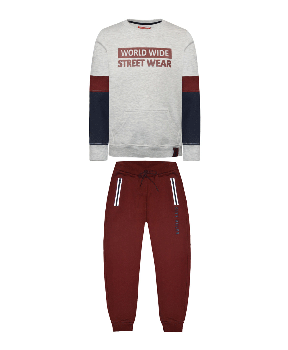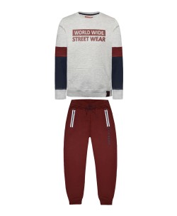 Φούτερ φόρμα με τύπωμα World Wide. Τα μανίκια της μπλούζας είναι τρίχρωμα. Το παντελόνι διαθέτει κορδόνι και τσέπες με φερμουάρ και αντίθεση χρώματος.
