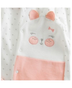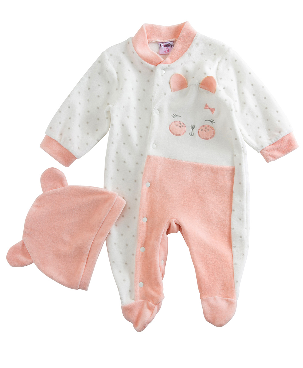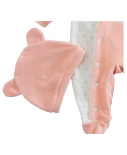 Φορμάκι βελουτέ μακρυμάνικο για κορίτσι σε λευκό - ροζ πούα χρώμα με σχέδια μπροστά. Περιλαμβάνει και ροζ σκουφάκι.