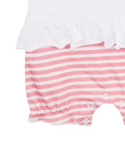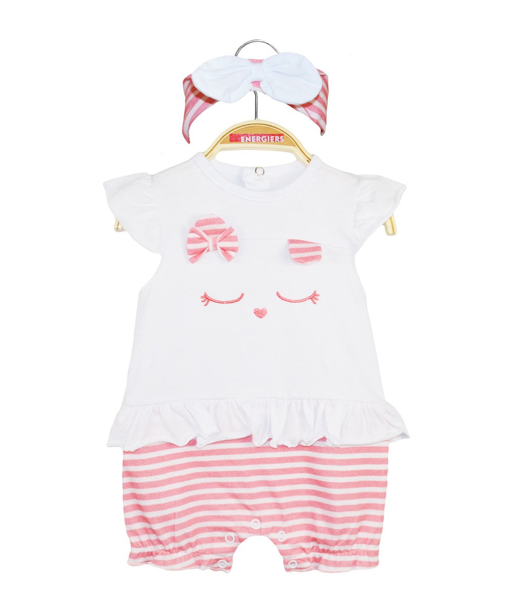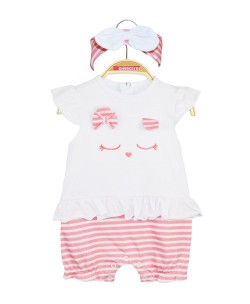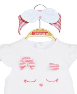 Φορμάκι για κορίτσι κοντομάνικο σε λευκό χρώμα με σχέδιο στο πάνω μέρος και ριγέ στο κάτω. Περιλαμβάνει και κορδέλα.