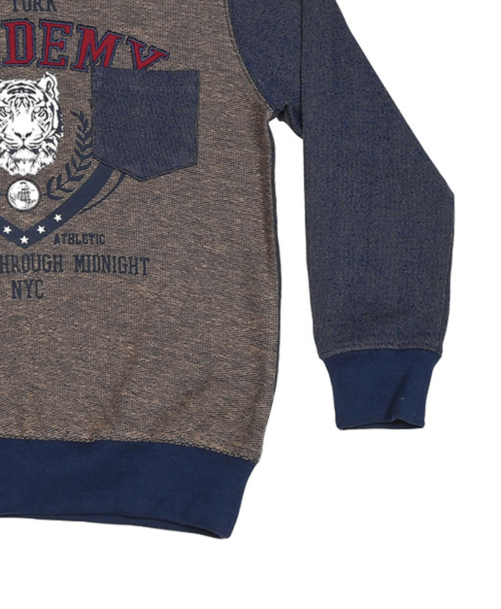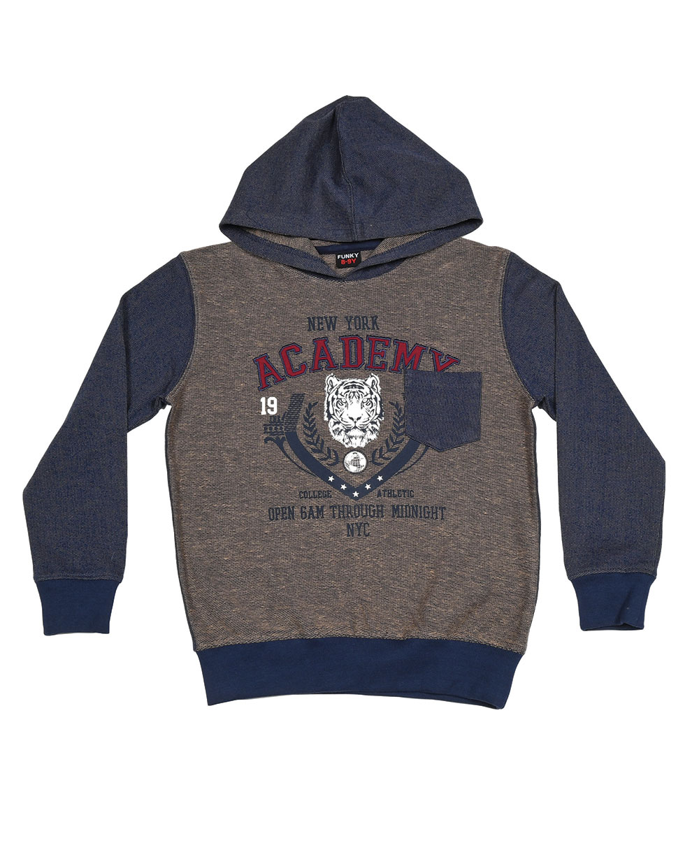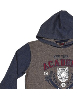 Μπλούζα φούτερ για αγόρι σε μπεζ χρώμα, με μπλε μανίκια και κουκούλα. Έχει γράμματα μπροστά. Ιδανική για φθινόπωρο, χειμώνα και άνοιξη.
