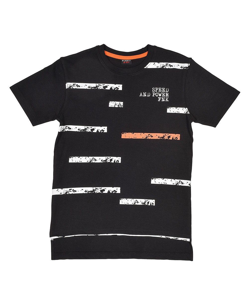 Μαύρη κοντομάνικη μπλούζα με σχέδια μπροστά.