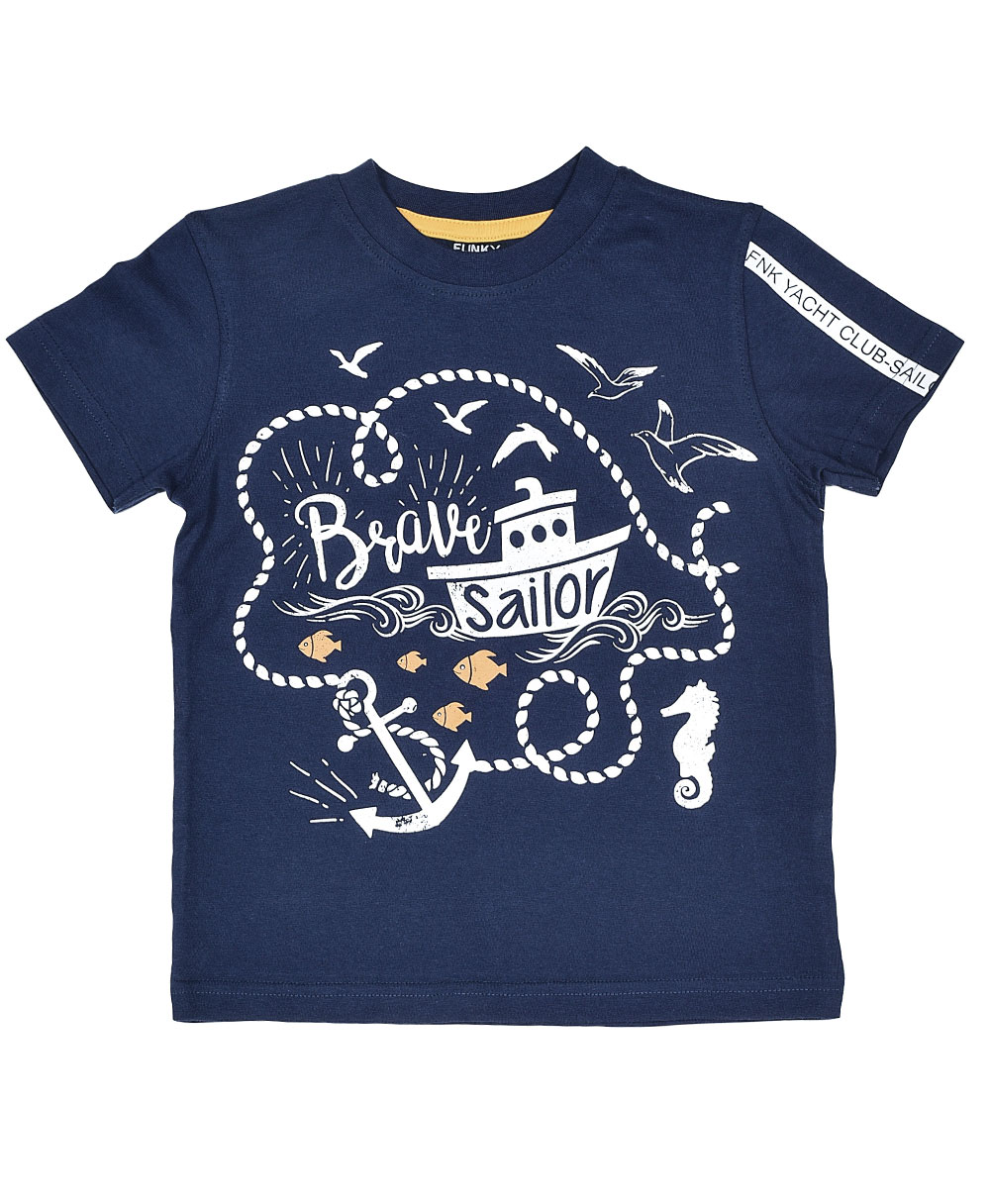 Μπλούζα μπλε κοντομάνικη με σχέδια μπροστά.