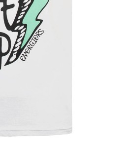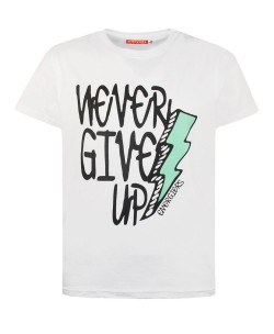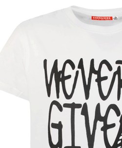 Λευκή κοντομάνικη μπλούζα με γράμματα μπροστά.
