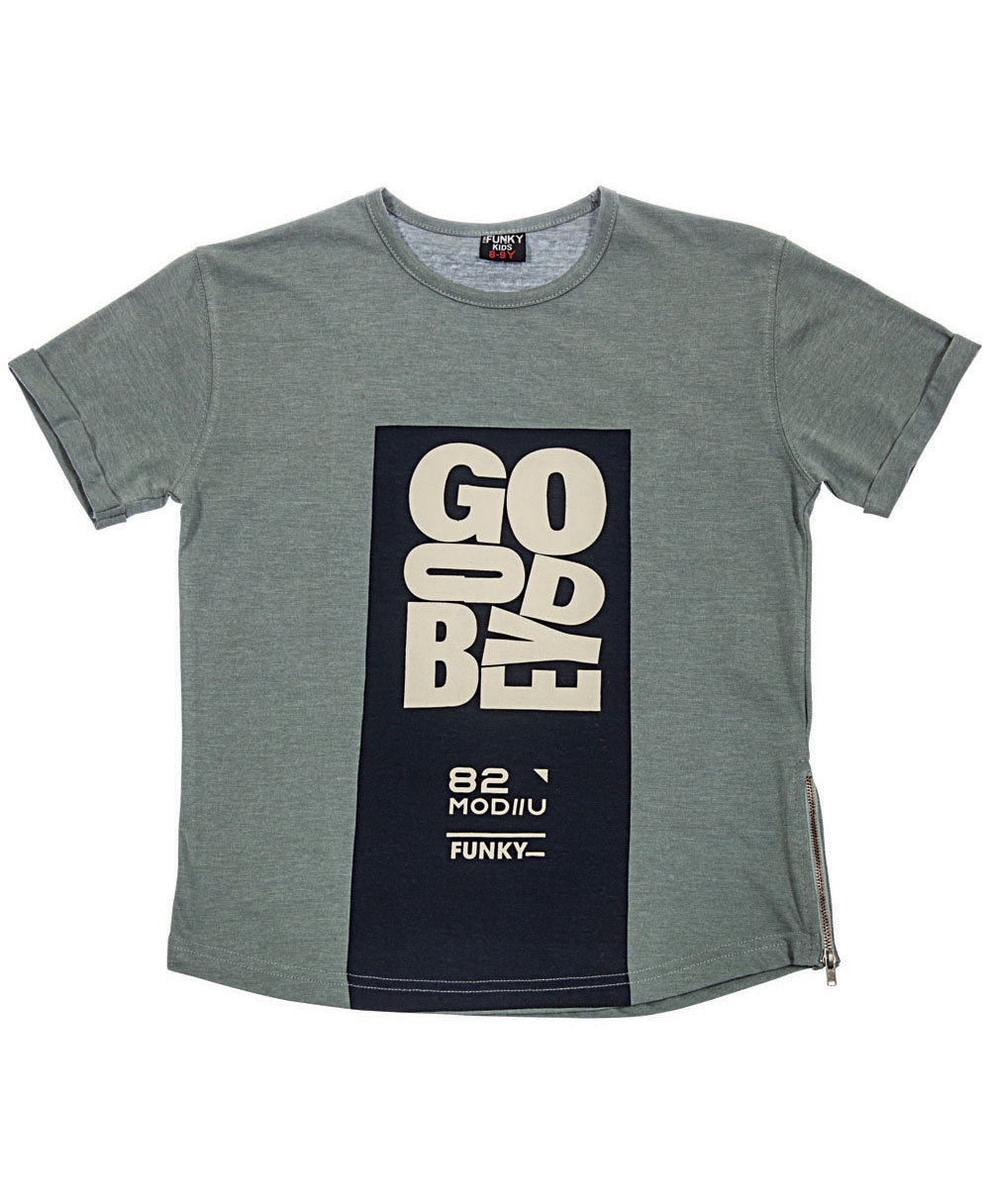 Μπλούζα κοντομάνικη σε λαδί χρώμα με γράμματα μπροστά και μαύρη λεπτομέρεια.