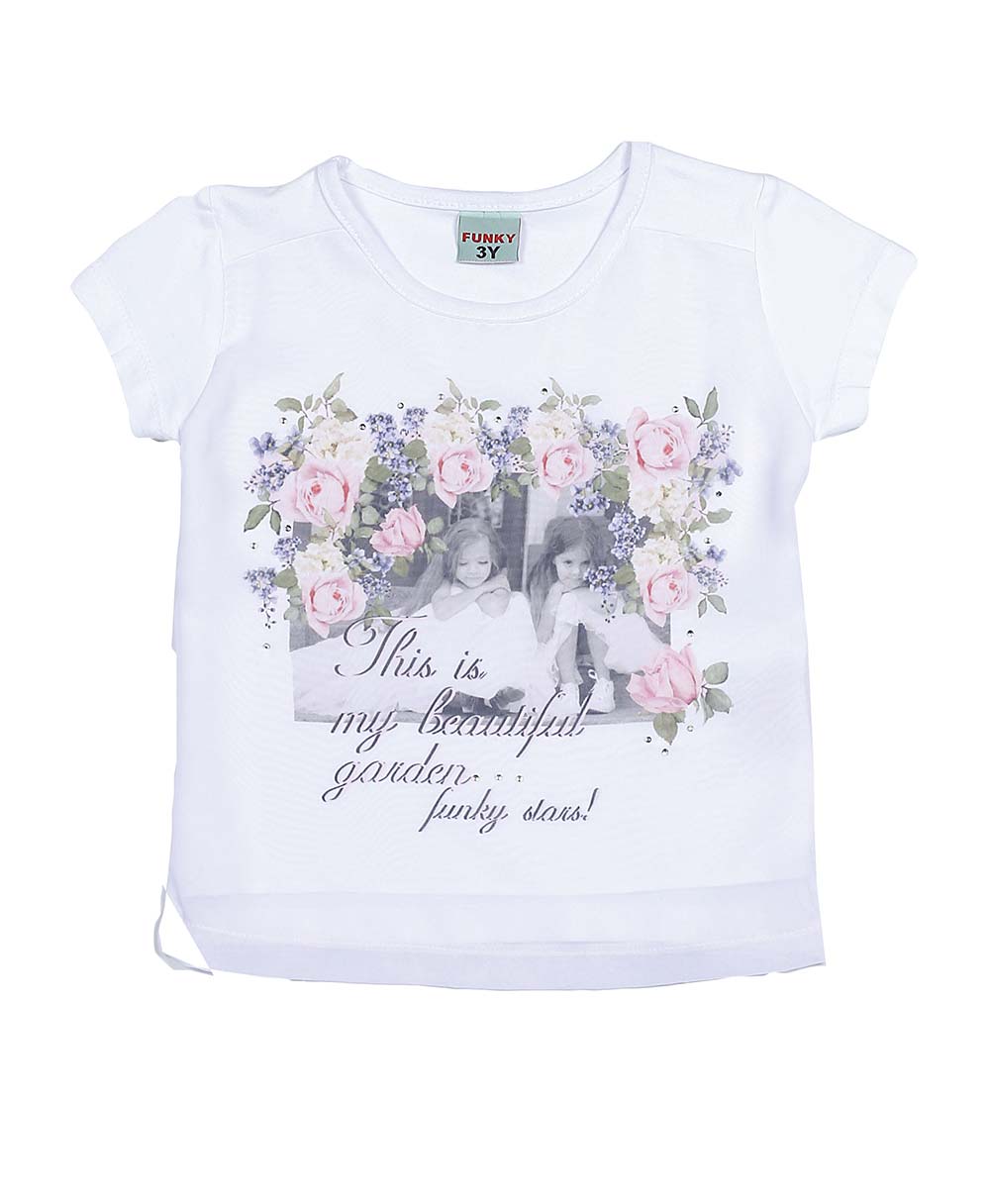 Μπλούζα λευκή κοντομάνικη με λουλούδια μπροστά και 2 κοριτσάκια.