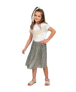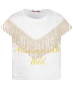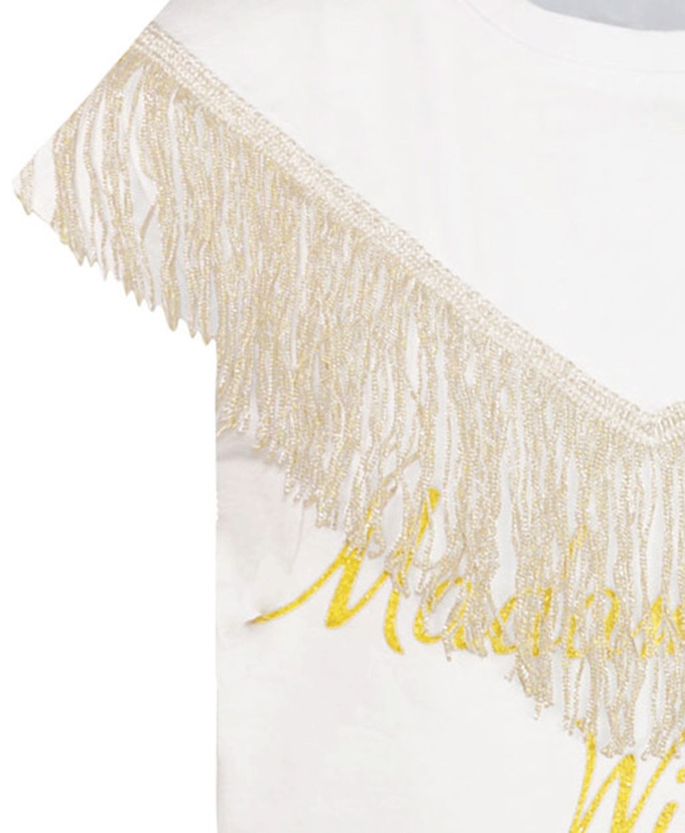 Μπλούζα εκρού κοντομάνικη με γράμματα και κρόσια μπροστά.