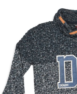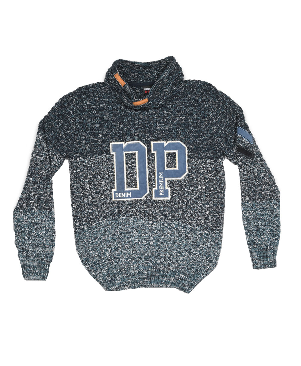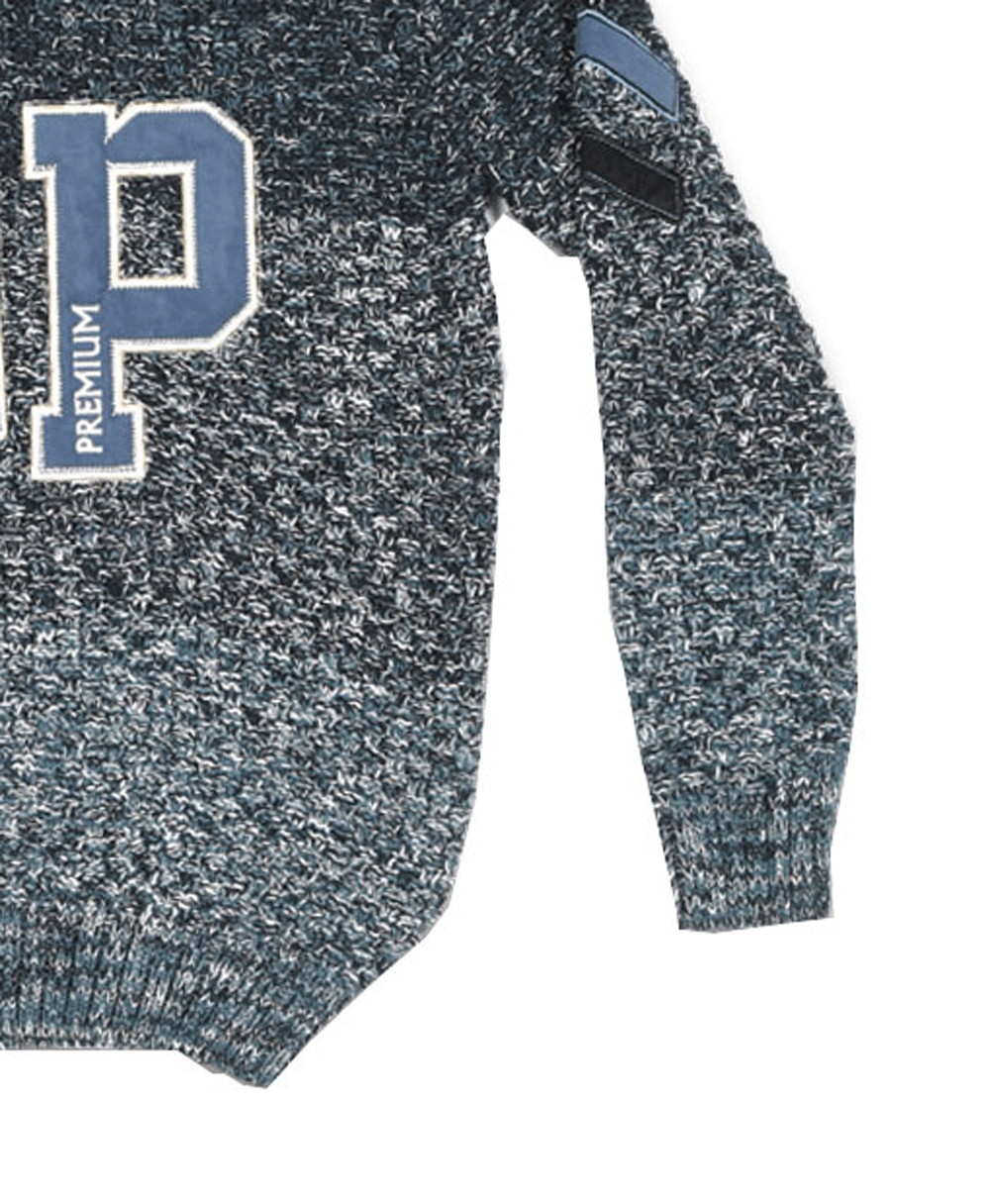 Μπλούζα πλεκτή για αγόρι σε μπλε σκούρο - γκρι - μπλε ανοιχτό χρώμα με μπεζ λεπτομέρειες στον λαιμό και γράμματα μπροστά.