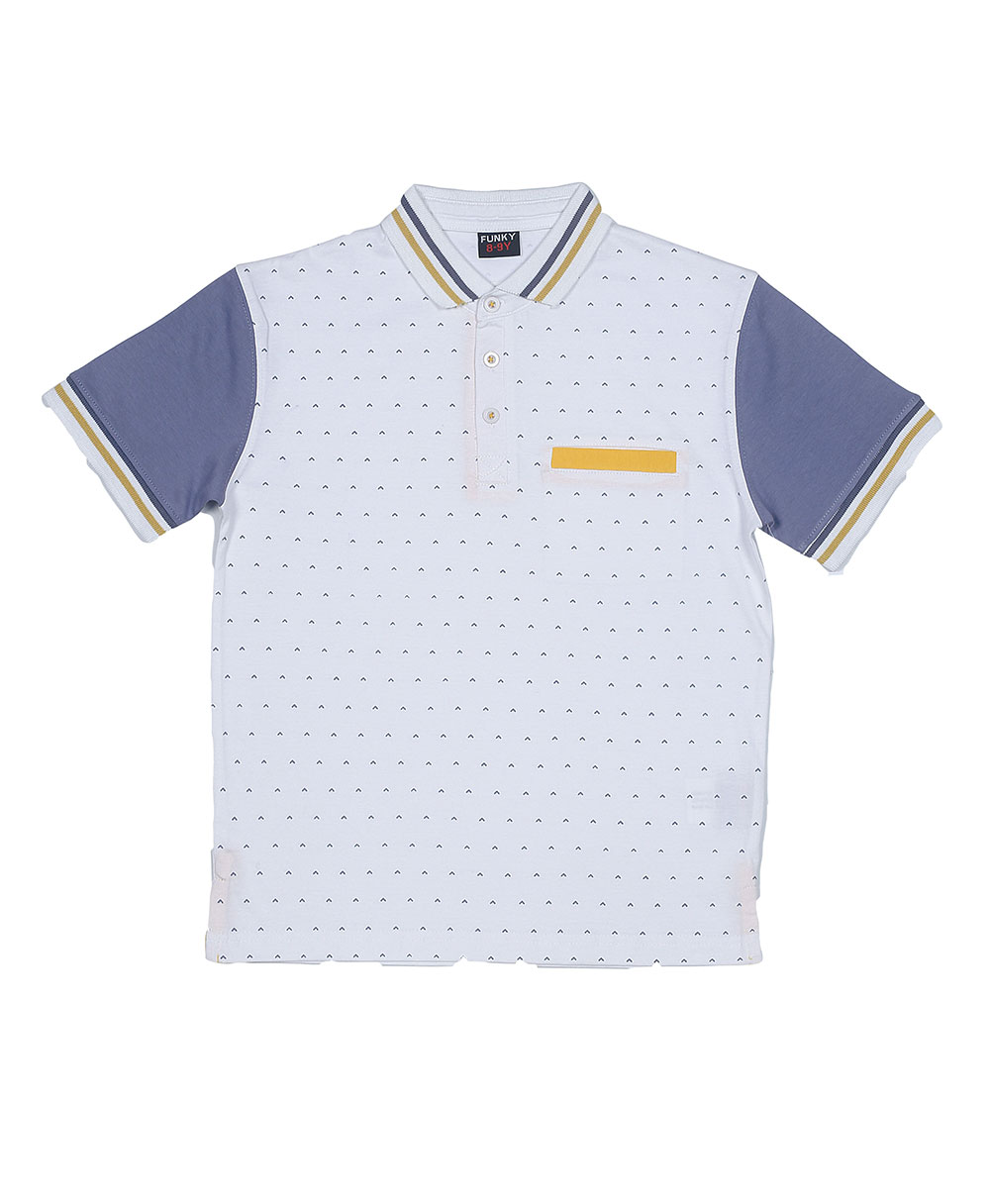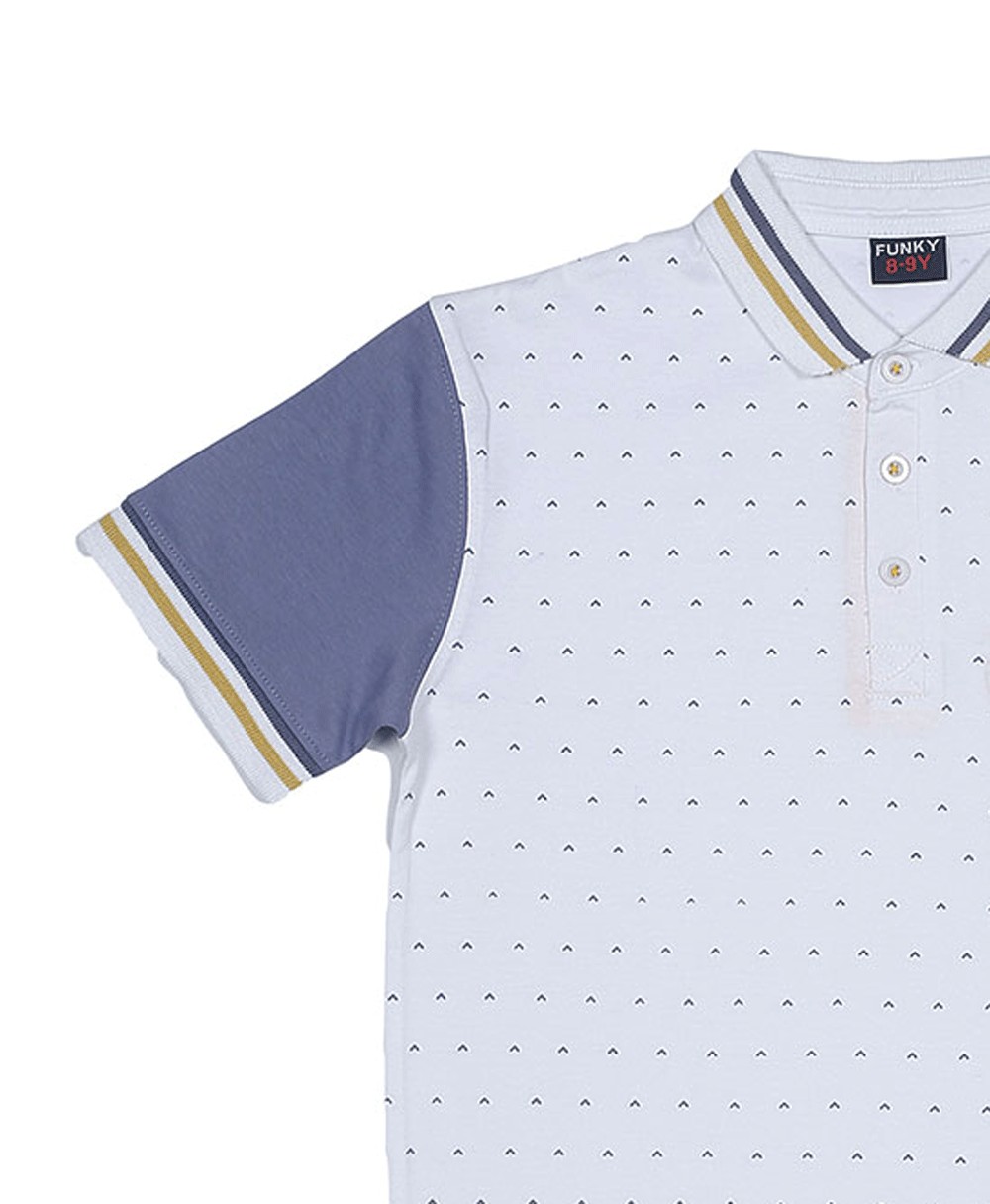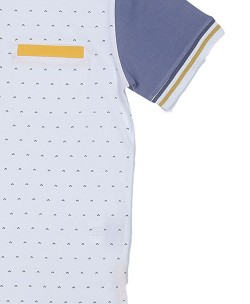 Μπλούζα πόλο λευκή κοντομάνικη με λεπτομέρειες στο γιακά και το μανίκι και σχέδια μπροστά.