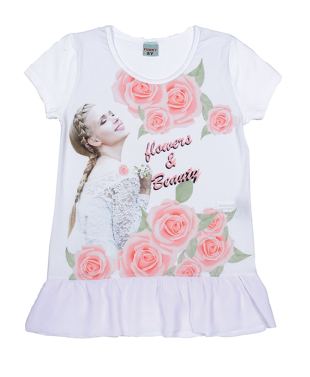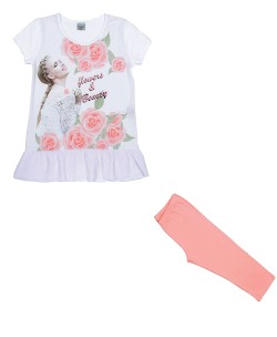 Σετ που αποτελείται από 2 κομμάτια: πάνω κοντομάνικη λευκή μπλούζα με σχέδιο μια κοπέλα και λουλούδια μπροστά. Κάτω σομόν κολάν κάπρι.