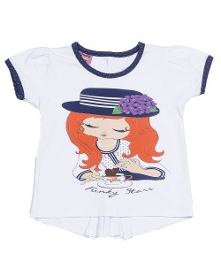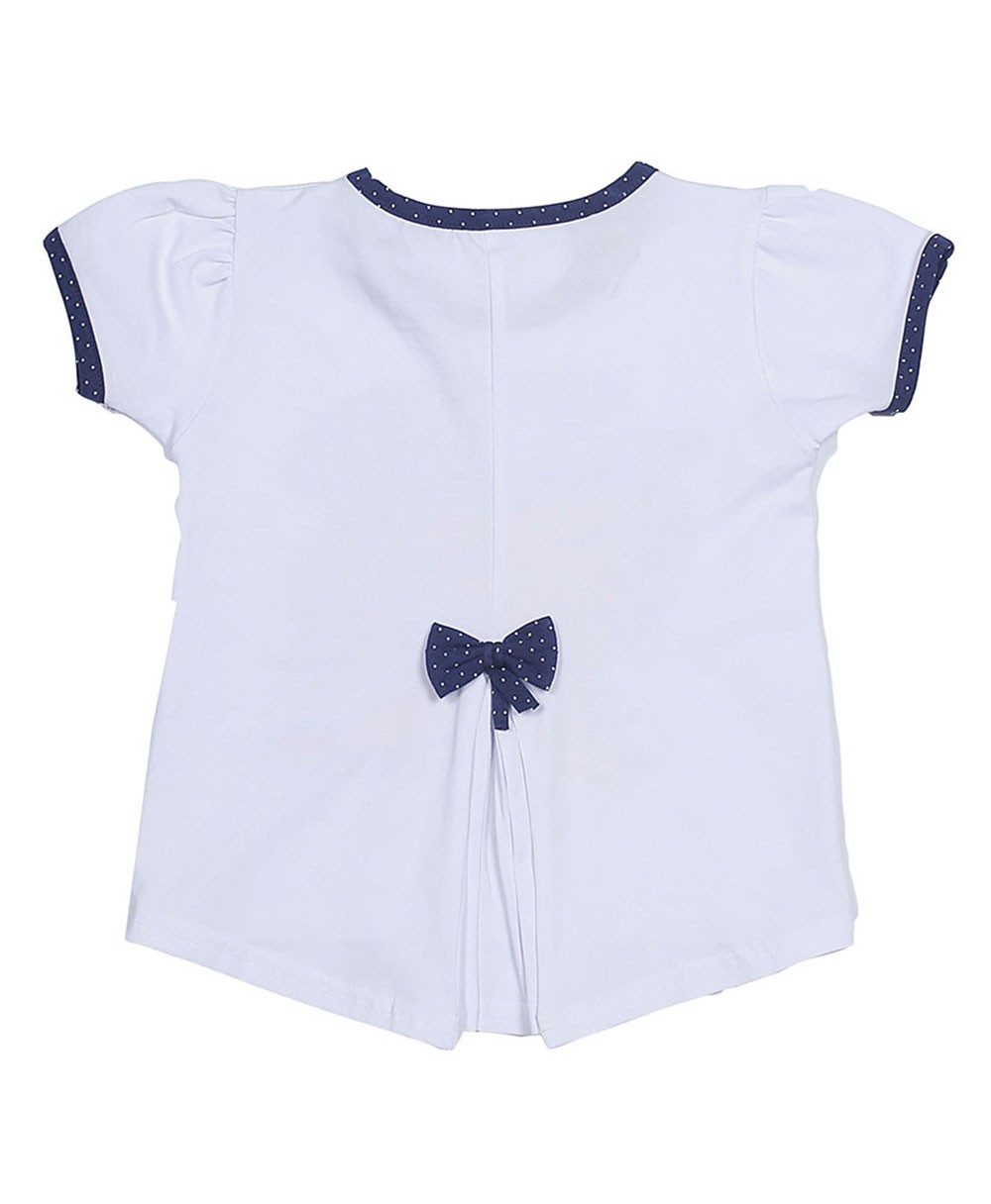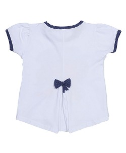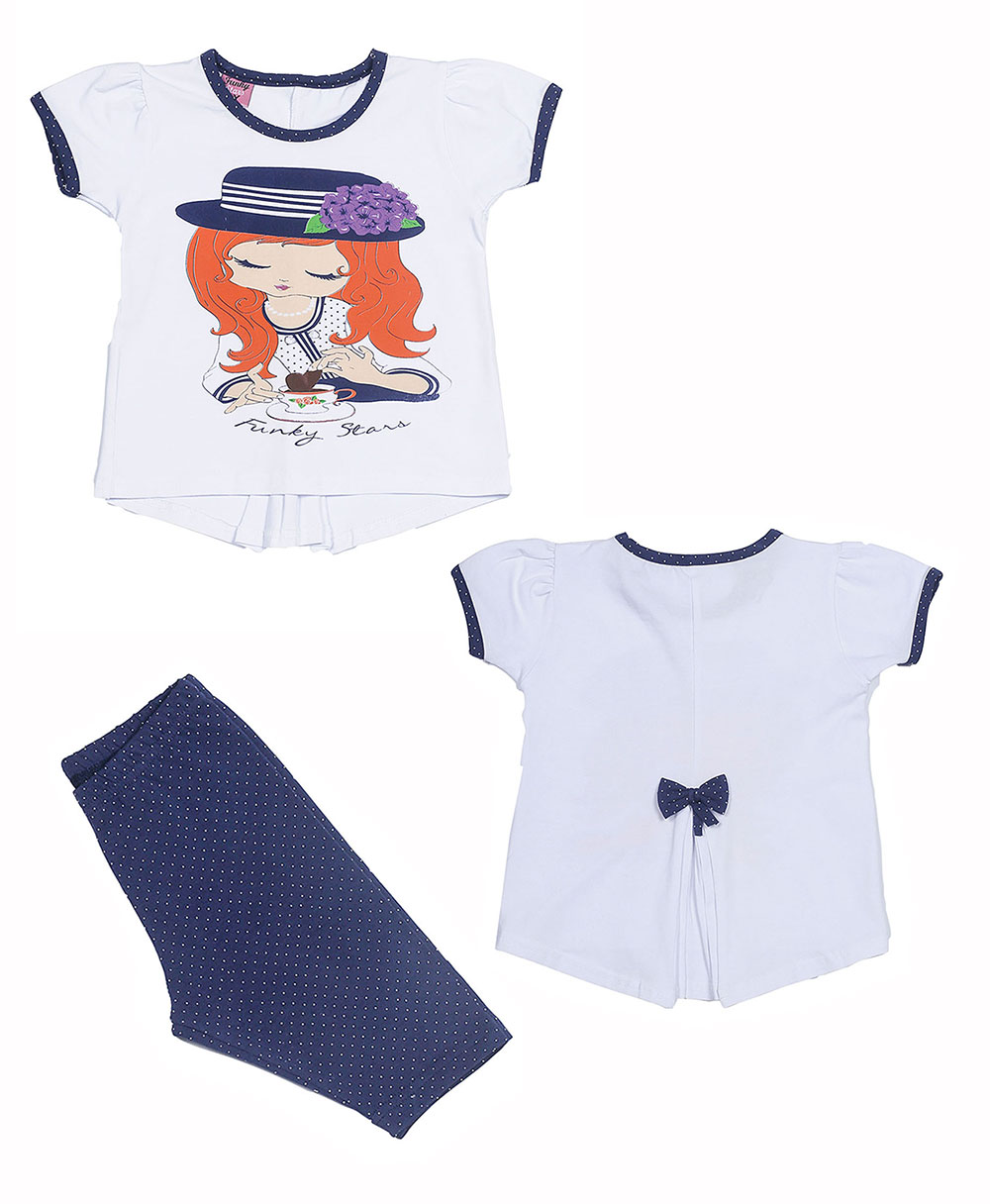 Σετ που αποτελείται από 2 κομμάτια: πάνω μέρος λευκή κοντομάνικη μπλούζα με κοπέλα μπροστά και σχέδιο με φιόγκο πίσω. Κάτω κάπρι μπλε πουά κολάν.