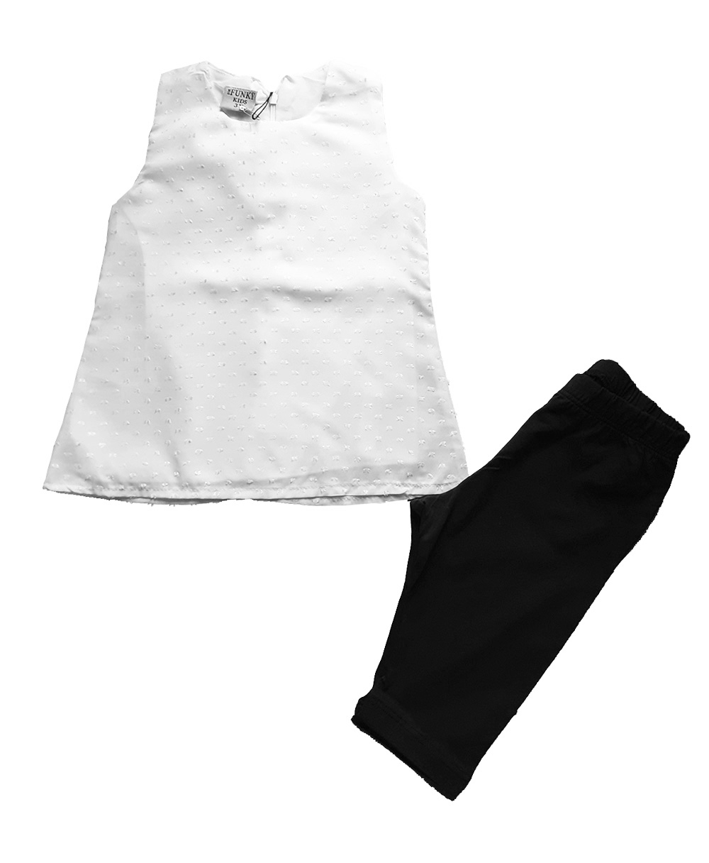 Σετ που αποτελείται από 2 κομμάτια: πάνω μέρος αμάνικο λευκό μπλουζάκι , κάτω μπλε κάπρι κολάν.