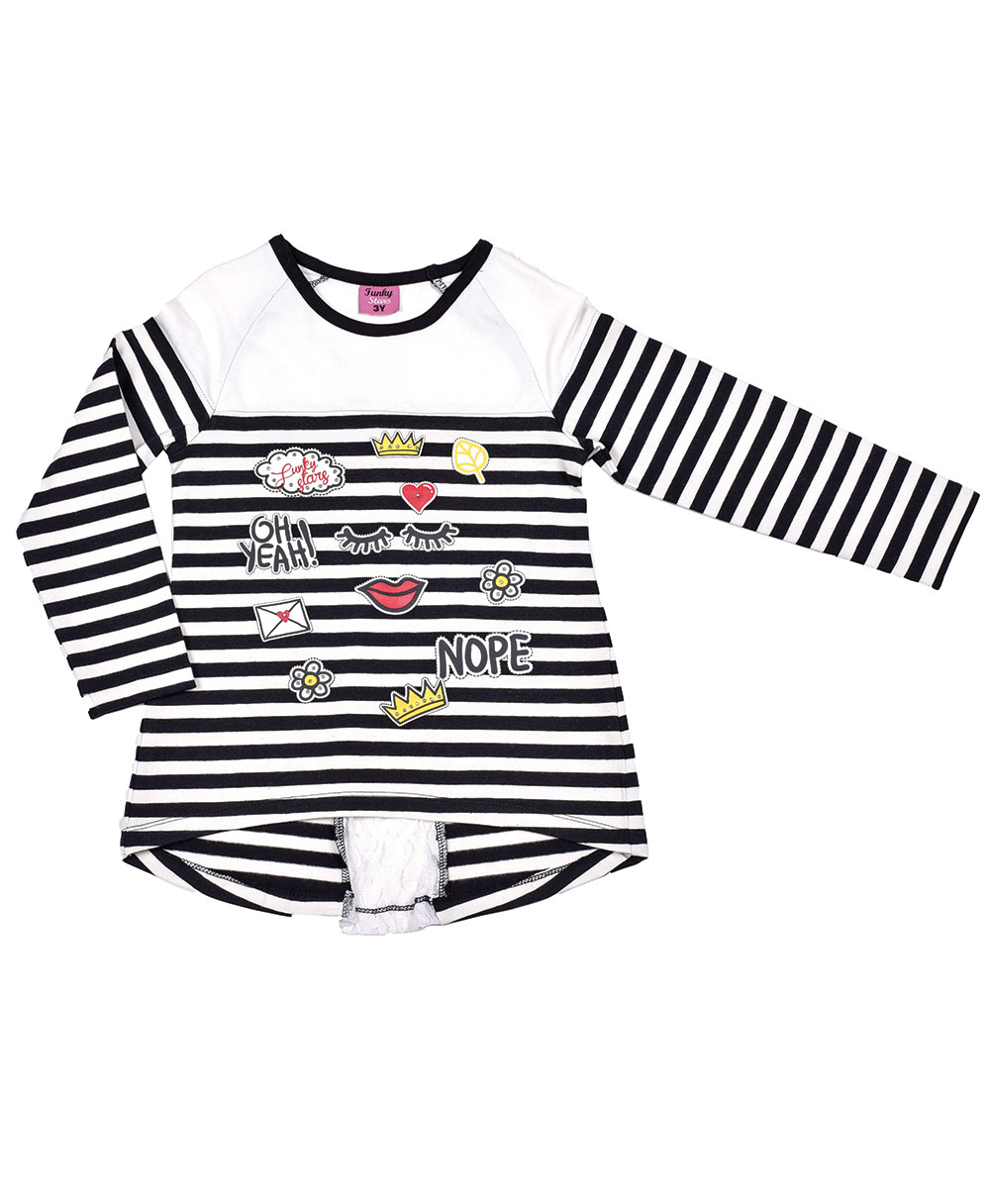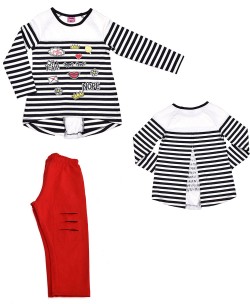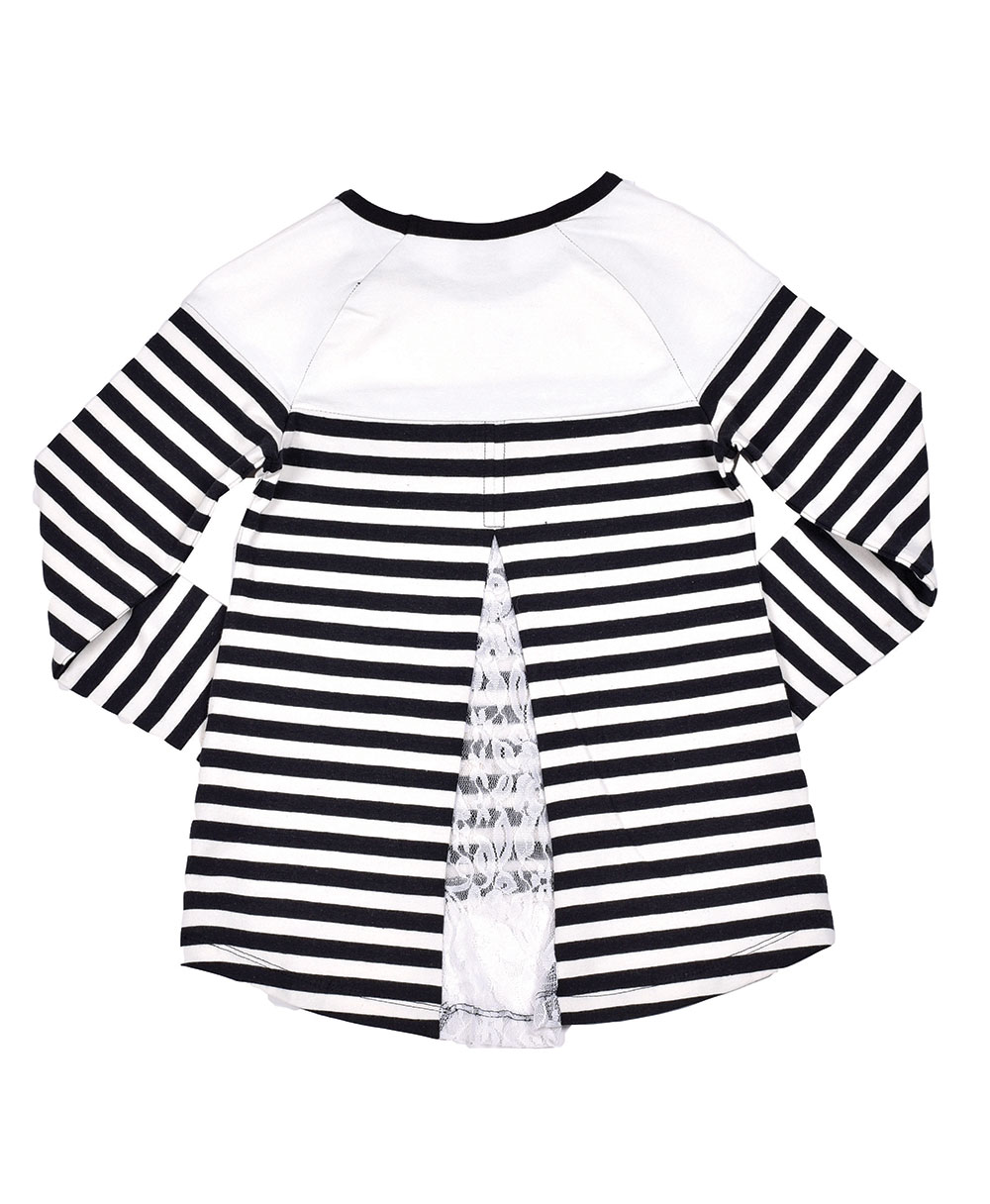 Μπλουζοφόρεμα με κολάν για κορίτσι. Αποτελείται από 2 κομμάτια: πάνω μέρος μπλουζοφόρεμα λευκό με μαύρη ρίγα και σχέδιο στο πίσω μέρος, κάτω μέρος μπορντώ κολάν.