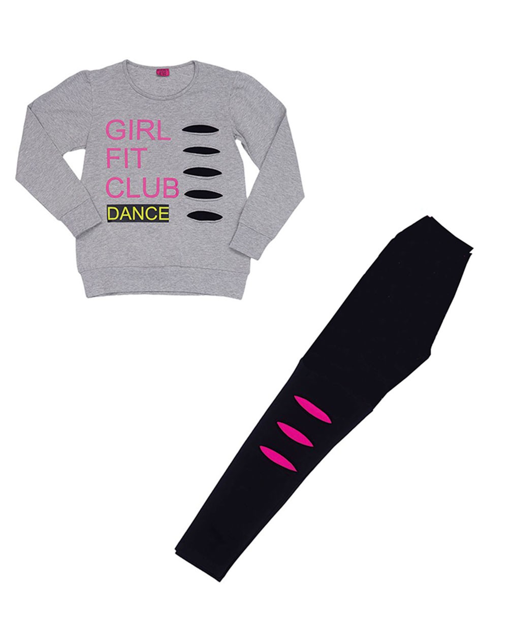Μπλουζοφόρεμα με κολάν για κορίτσι. Αποτελείται από 2 κομμάτια: πάνω μέρος μπλουζοφόρεμα γκρι με σχέδιο μπροστά, κάτω εμπριμέ κολάν μαύρο.
