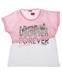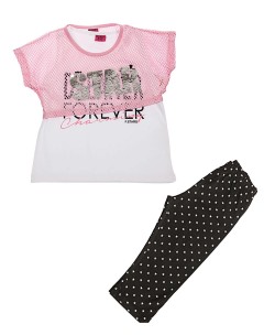 Μπλουζοφόρεμα με κολάν για κορίτσι. Αποτελείται από 2 κομμάτια: πάνω μέρος μπλουζοφόρεμα ροζ και λευκό με γράμματα μπροστά, κάτω μαύρο πουά κολάν.
