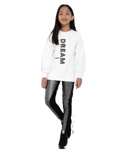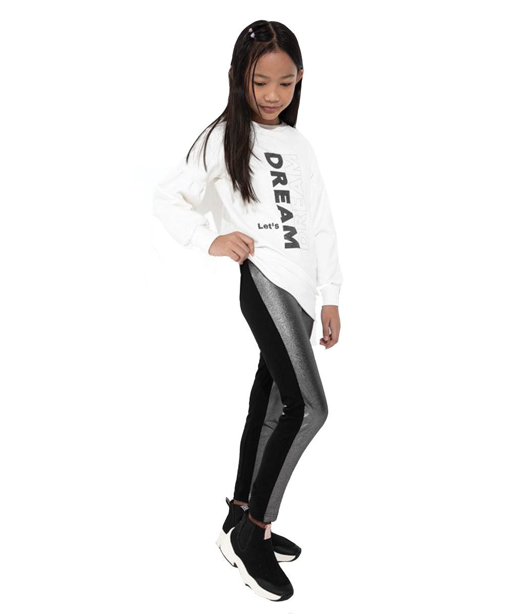 Μπλουζοφόρεμα με κολάν για κορίτσι. Αποτελείται από 2 κομμάτια: πάνω μέρος μπλουζοφόρεμα εκρού με γράμματα μπροστά, κάτω μαύρο - ασημί κολάν.