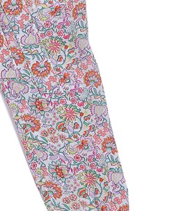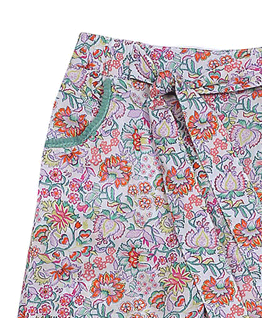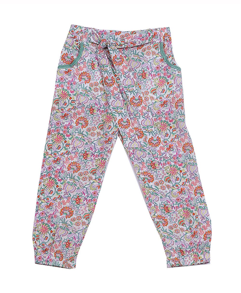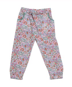 Παντελόνα εμπριμε με λουλούδια για μικρές δεσποινίδες. Στην εσωτερική πλευρά της μέσης υπάρχει λάστιχο για αυξομείωση του μεγέθους.