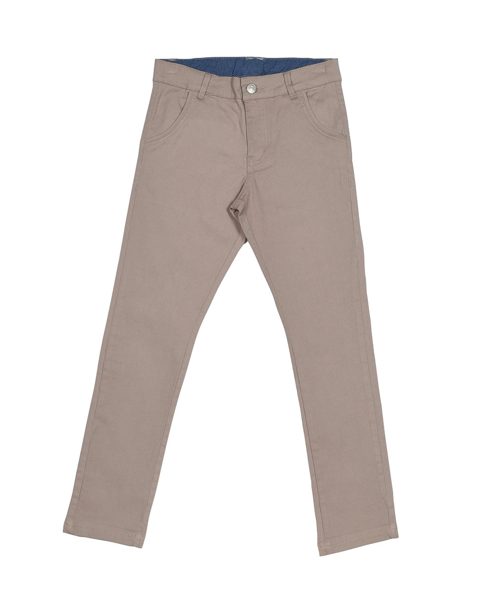 Παντελόνι σταθερό σε μπεζ χρώμα. Στην εσωτερική πλευρά της μέσης υπάρχει λάστιχο για αυξομείωση του μεγέθους.