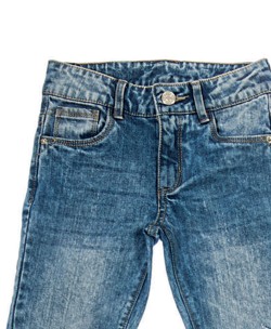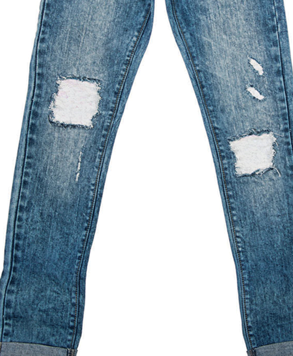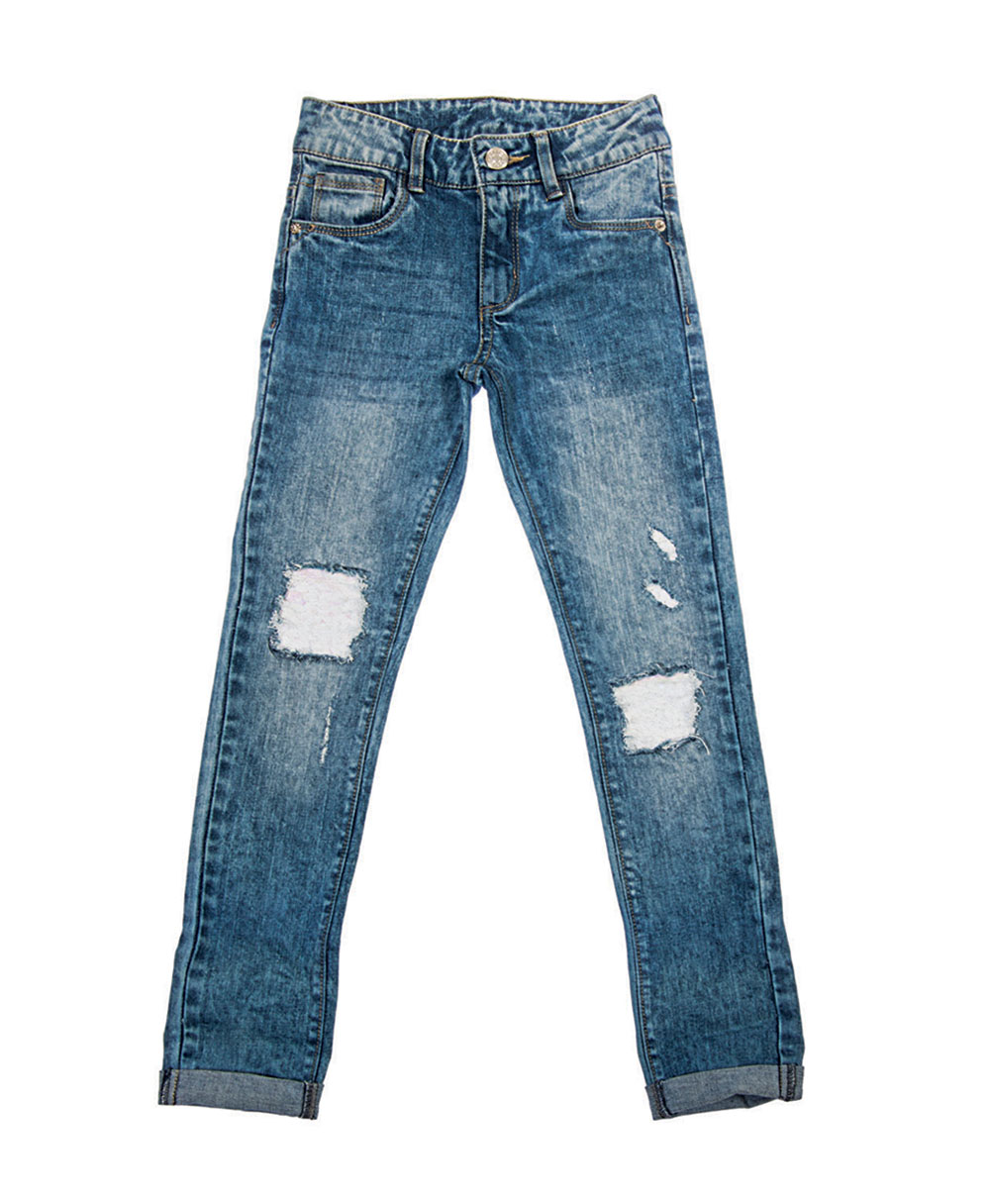 Παντελόνι τζιν με πούλιες στα σκισίματα για μοντέρνα ντυσίματα. Στην εσωτερική πλευρά της μέσης υπάρχει λάστιχο για αυξομείωση του μεγέθους.