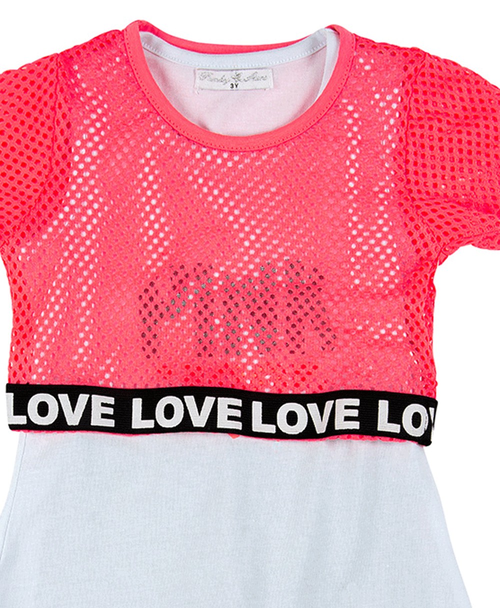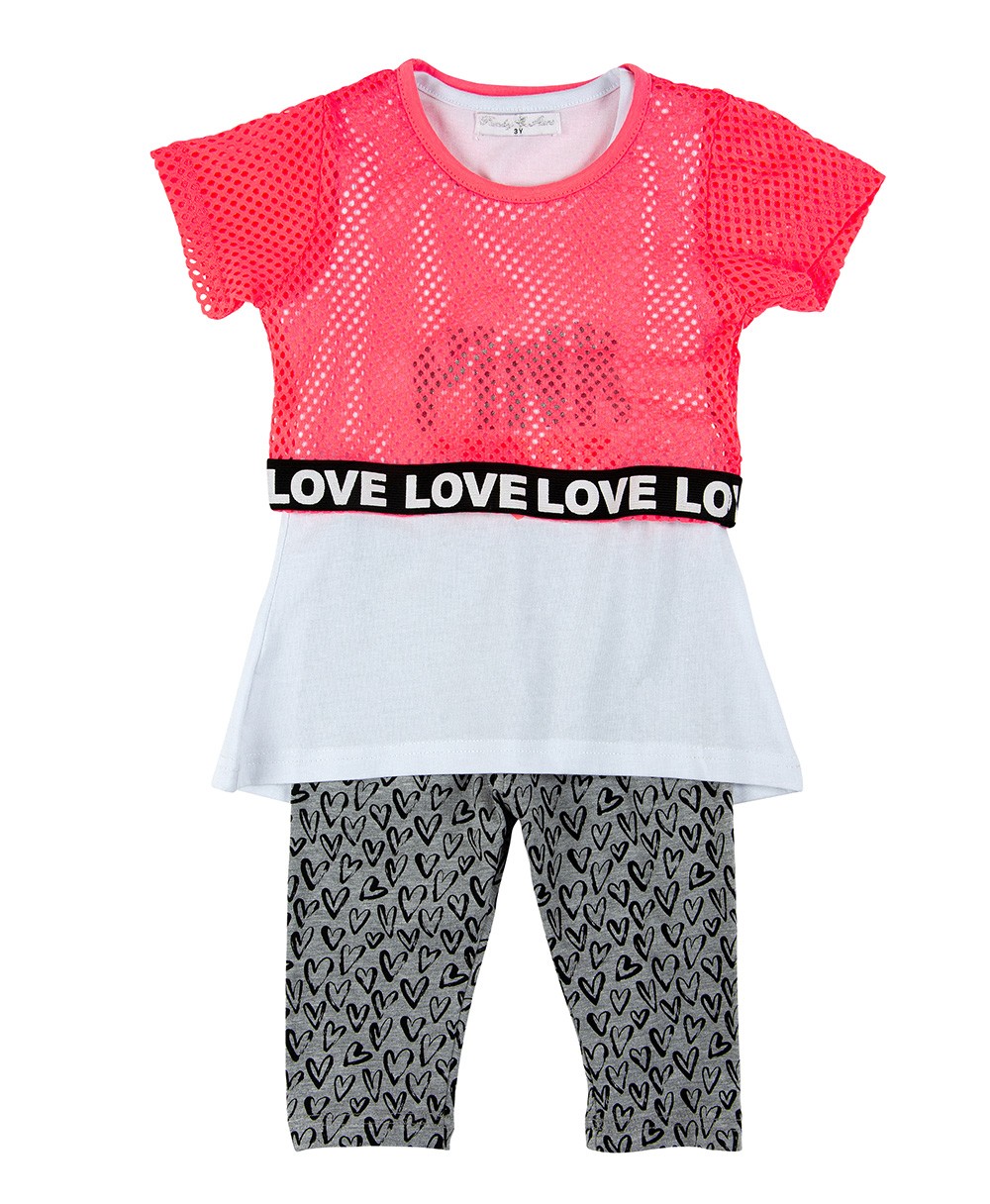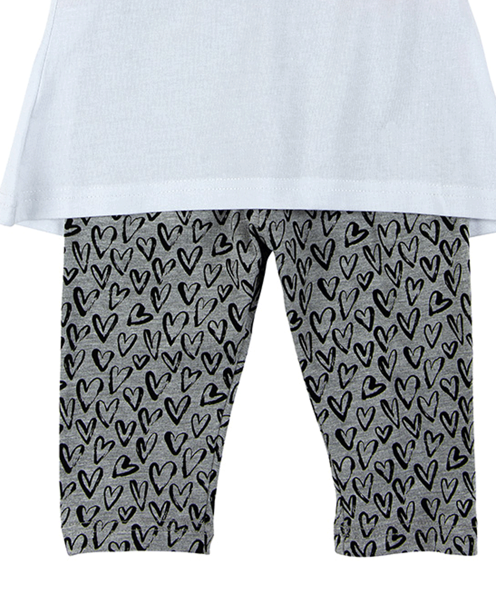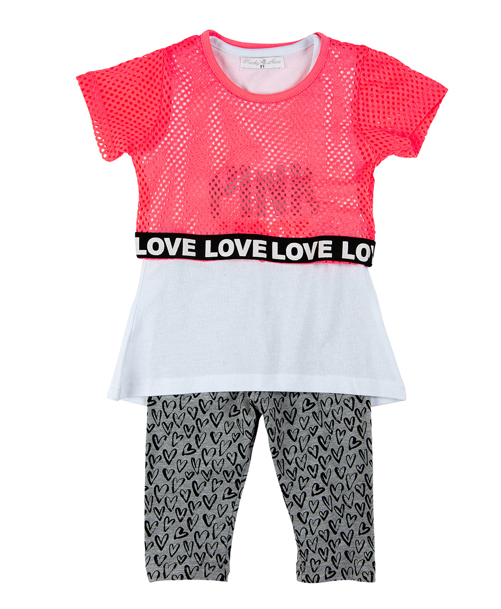 Σετ που αποτελείται από 2 κομμάτια: πάνω λευκή αμάνικη μπλούζα με γράμματα μπροστά και ροδακινί δίχτυ, κάτω γκρι κολάν με μαύρες καρδούλες.