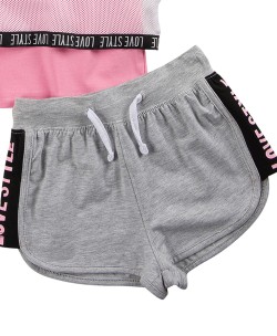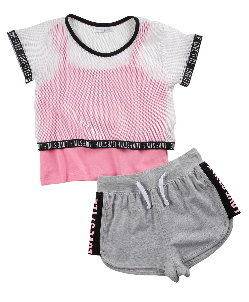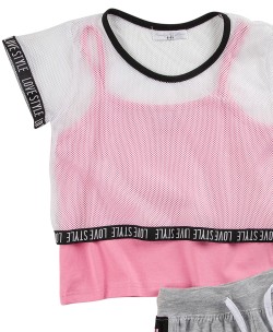Σετ που αποτελείται από 3 κομμάτια: πάνω κοντομάνικο δίχτυ σε λευκό χρώμα και ροζ αμάνικη μπλούζα, κάτω σορτσάκι γκρι με λεπτομέρεια στο πλάι.