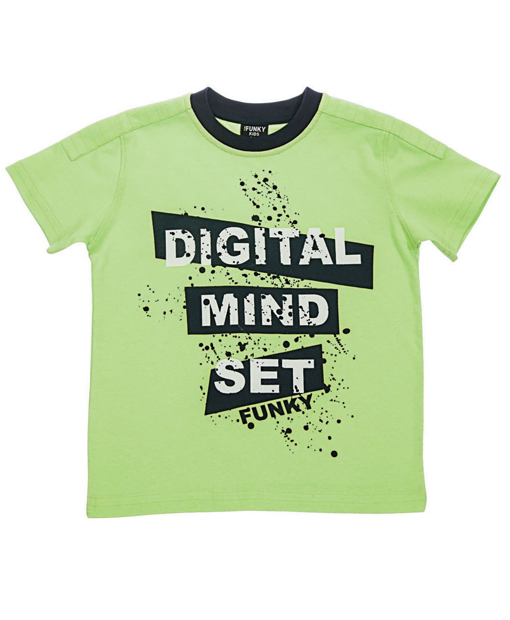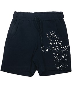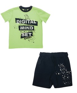 Σετ που αποτελείται από 2 κομμάτια: πάνω λάιμ κοντομάνικη μπλούζα με γράμματα μπροστά και κάτω μπλε σκούρα βερμούδα.