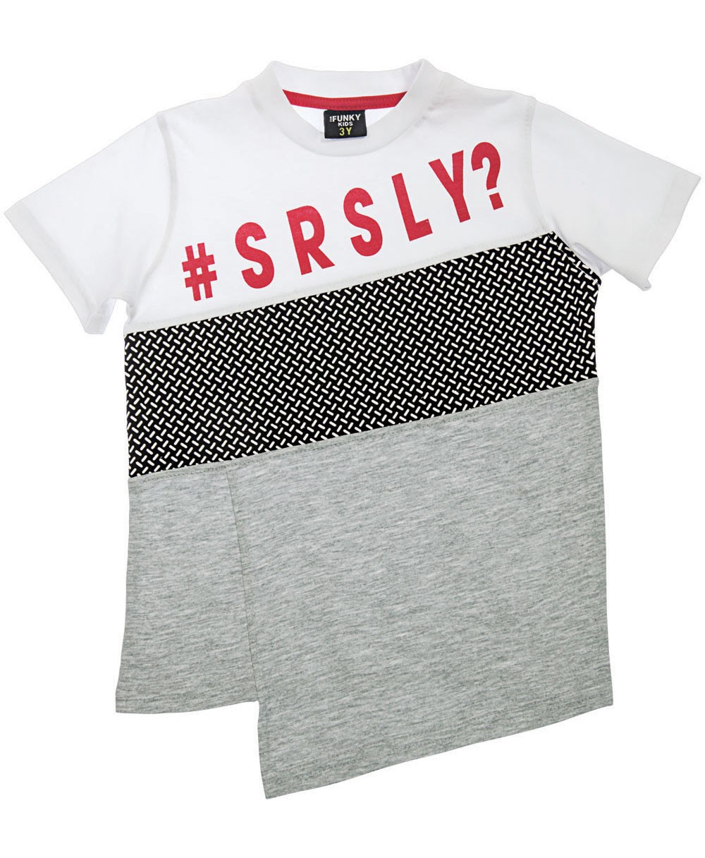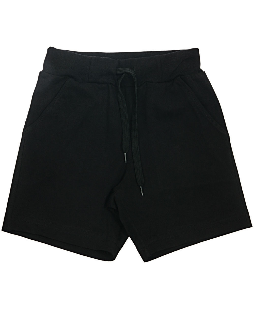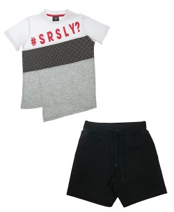 Σετ που αποτελείται από 2 κομμάτια: πάνω λευκή κοντομάνικη μπλούζα με μοντέρνα σχέδια και κάτω μαύρη βερμούδα.