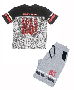 Σετ που αποτελείται από 2 κομμάτια: πάνω ασπρόμαυρη μπλούζα με πορτοκαλί λεπτομέρειες. Κάτω γκρι βερμούδα με μαύρες λεπτομέρειες και πορτοκαλί αριθμούς.