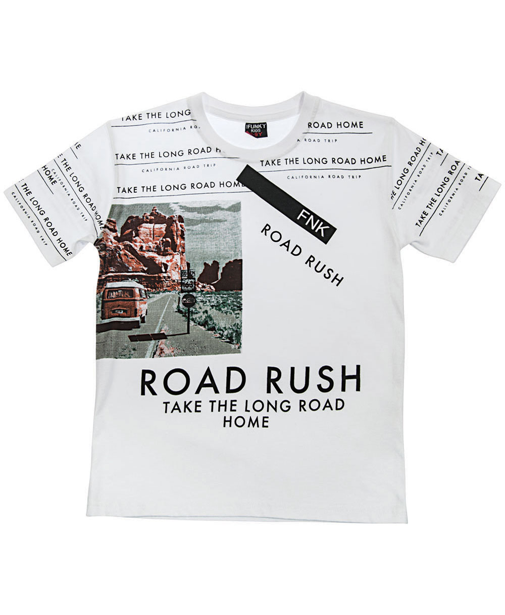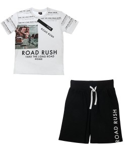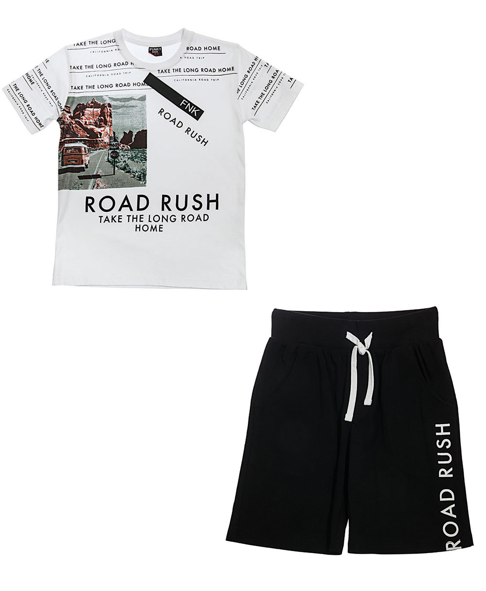 Σετ που αποτελείται από 2 κομμάτια: πάνω λευκή μπλούζα με γράμματα και σχέδια μπροστά. Κάτω μαύρη βερμούδα με γράμματα.