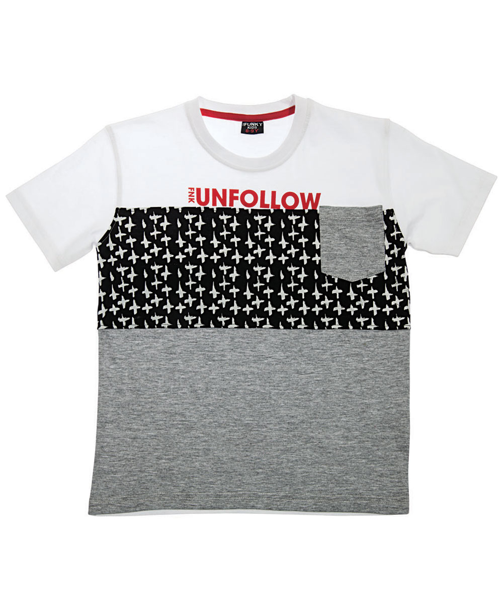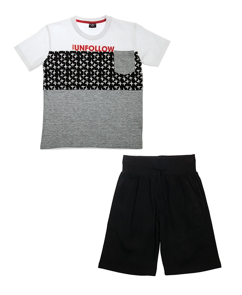Σετ που αποτελείται από 2 κομμάτια: πάνω λευκή - γκρι μπλούζα με γράμματα μπροστά. Κάτω μαύρη βερμούδα.