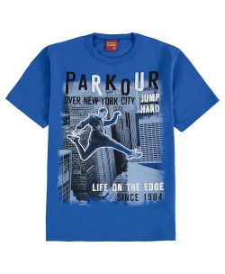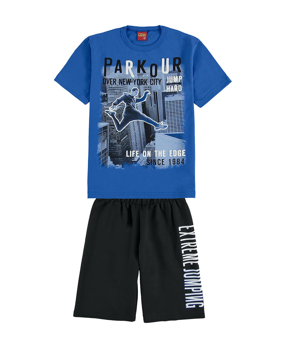 Σετ που αποτελείται από 2 κομμάτια: πάνω μπλε μπλούζα με σχέδια μπροστά. Κάτω μαύρη βερμούδα.