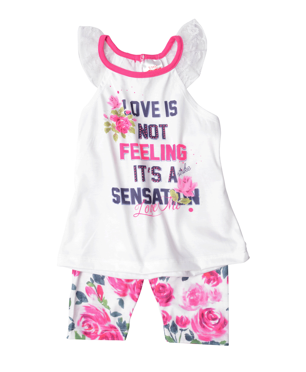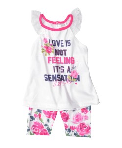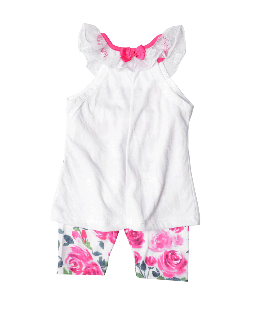 Σετ που αποτελείται από 2 κομμάτια: πάνω λευκή μπλούζα με παρτούς ώμους και λεπτομέρεια στο λαιμό δαντέλα και πίσω φούξια φιόγκο με σχέδια μπροστά. Κάτω κάπρι κολάν εμπριμέ με λουλούδια.