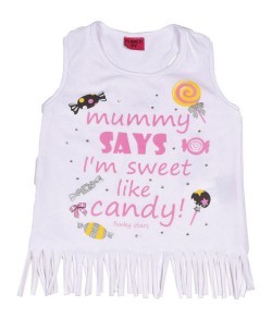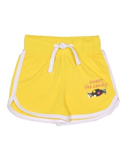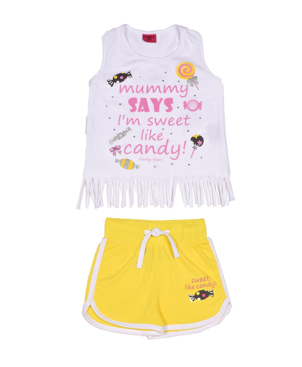 Σετ που αποτελείται από 2 κομμάτια: πάνω λευκή αμάνικη μπλούζα με σχέδια μπροστά και κρόσια στο κάτω μέρος, κάτω σορτσάκι κίτρινο με λευκές λεπτομέρειες.