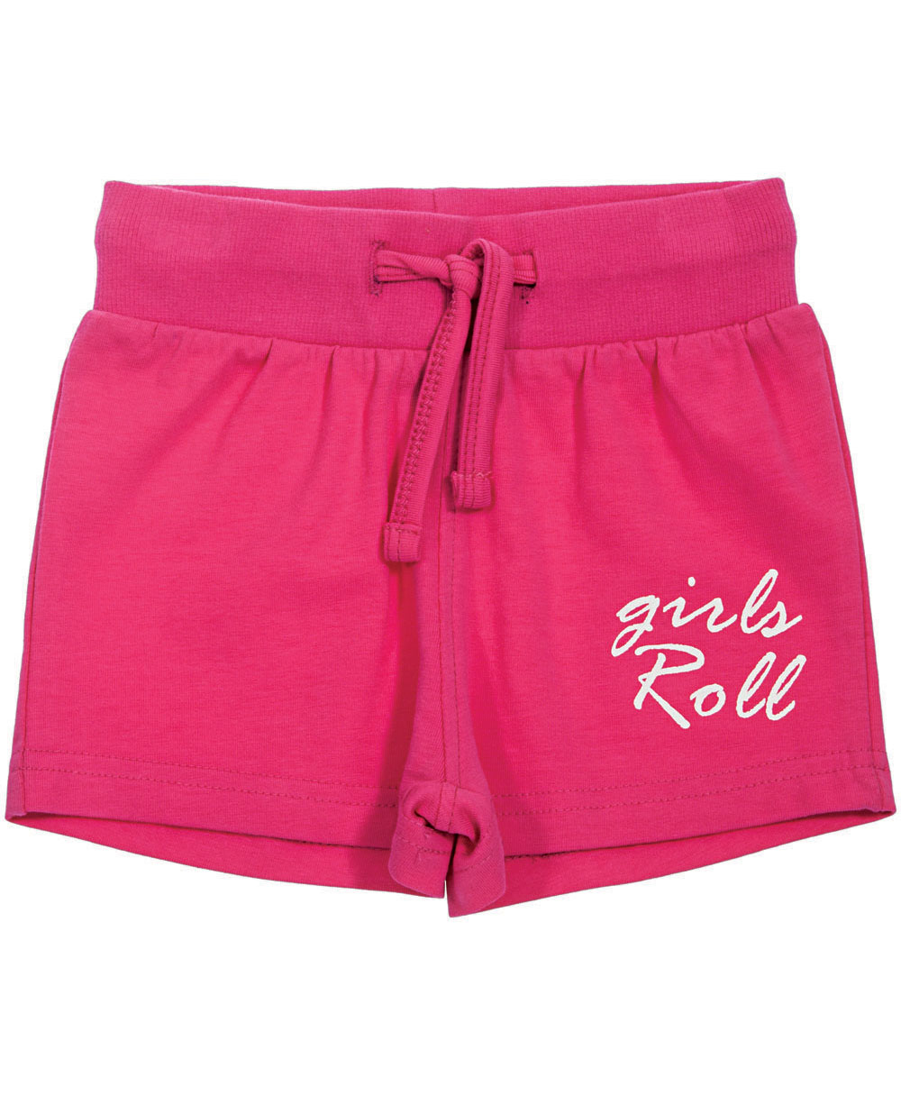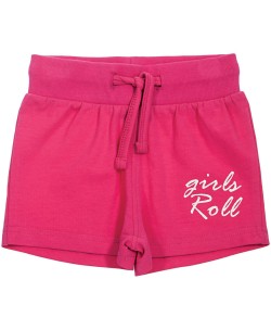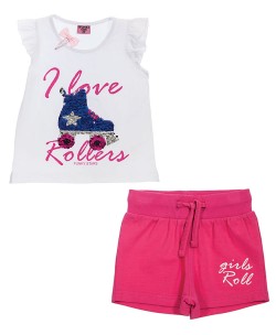 Σετ που αποτελείται από 2 κομμάτια: πάνω λευκή κοντομάνικη μπλούζα με σχέδια μπροστά, κάτω σορτσάκι φούξια.