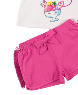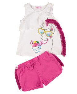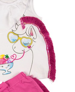 Σετ που αποτελείται από 2 κομμάτια: πάνω λευκή αμάνικη μπλούζα με σχέδιο μπροστά, κάτω φούξια σορτσάκι.