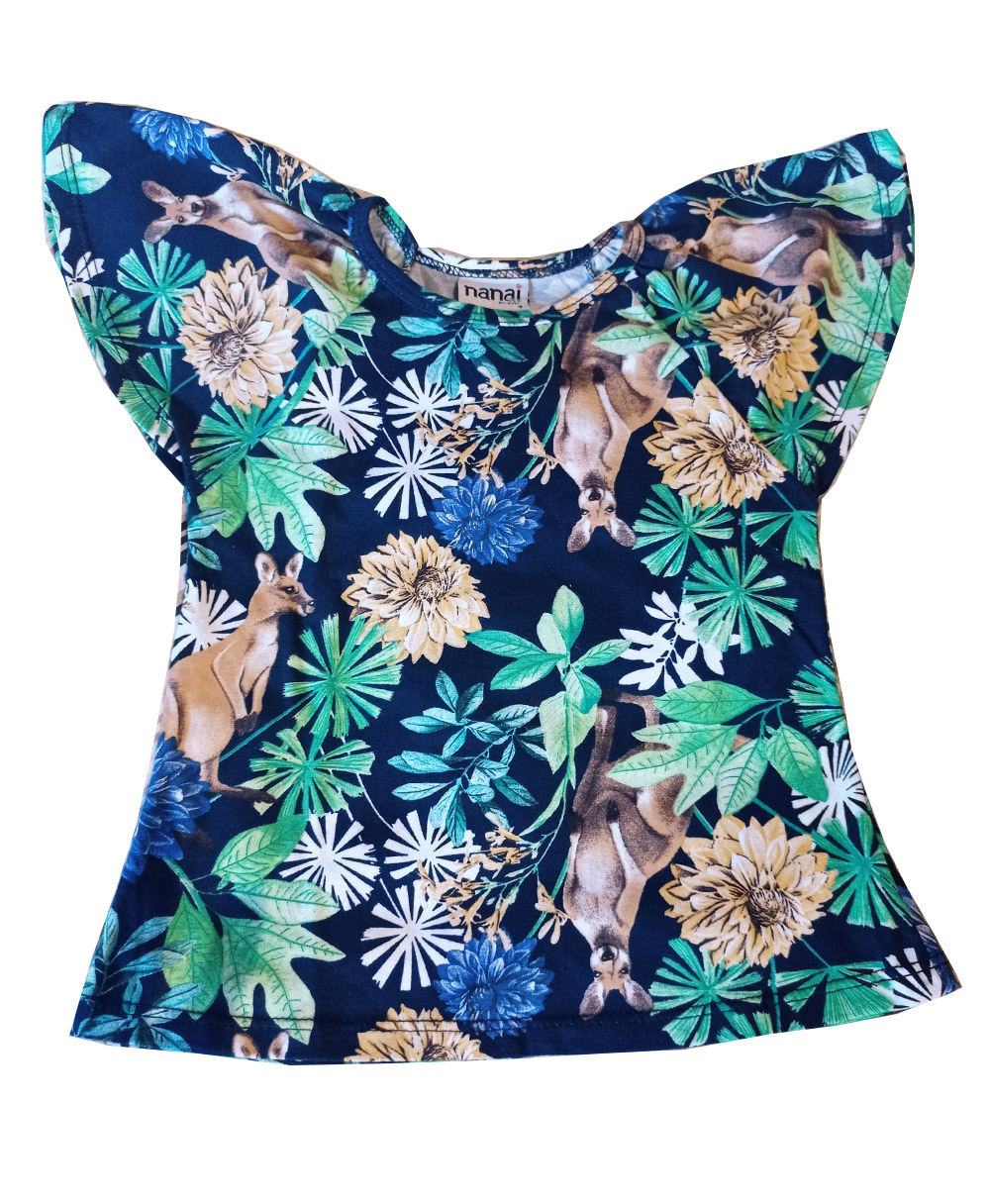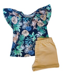 Σετ που αποτελείται από 2 κομμάτια: πάνω εμπριμέ κοντομάνικη μπλούζα, κάτω μουσταρδί σορτσάκι.