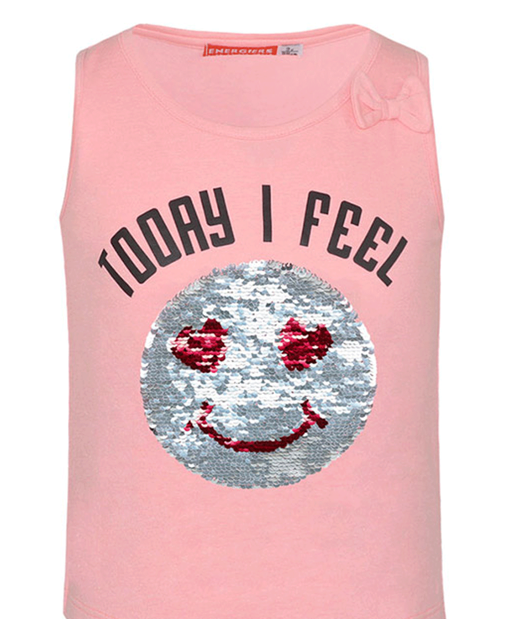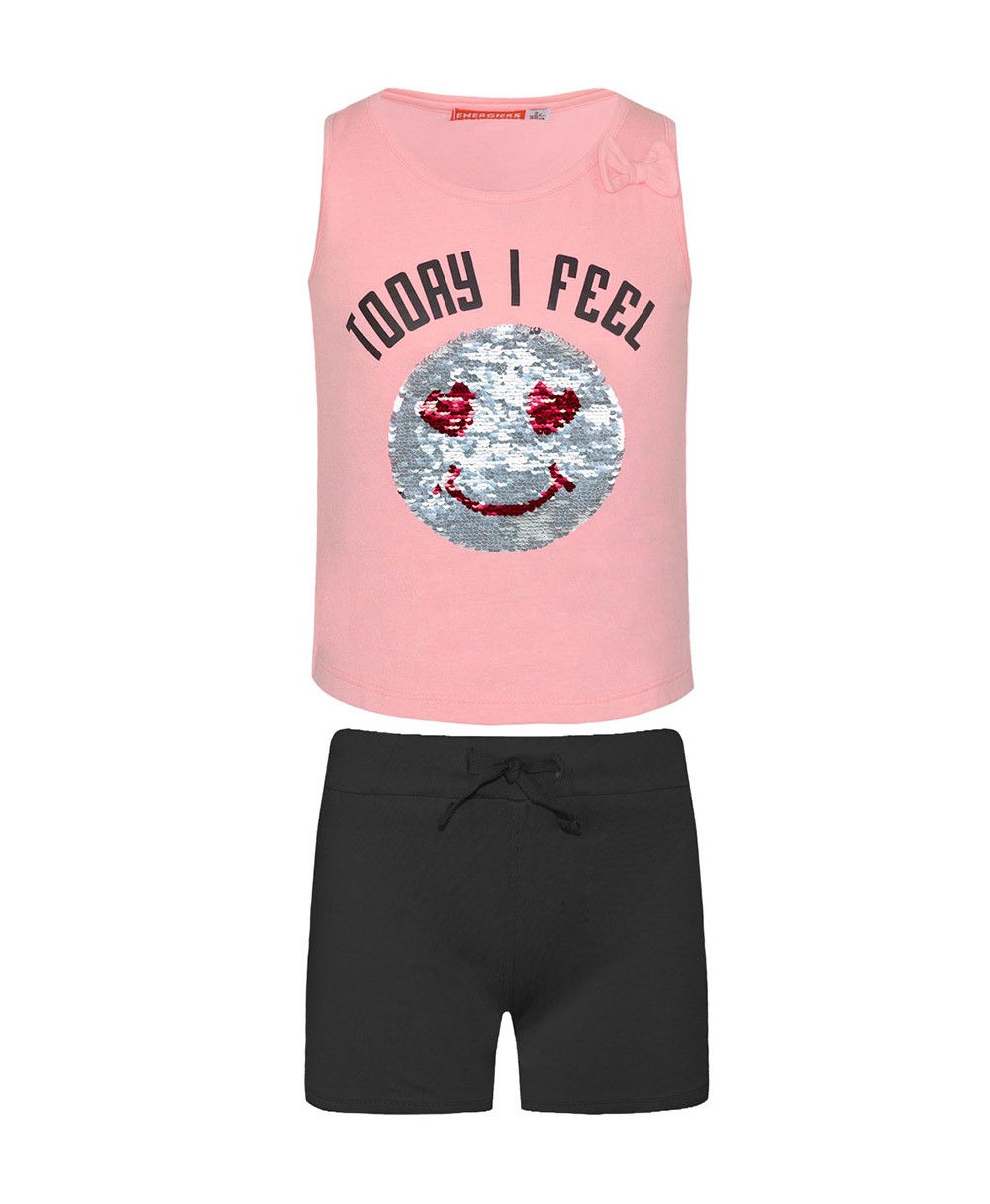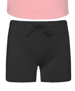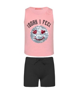 Σετ που αποτελείται από 2 κομμάτια: πάνω ροζ αμάνικη μπλούζα με γράμματα μπροστά, κάτω μαύρο σορτσάκι.