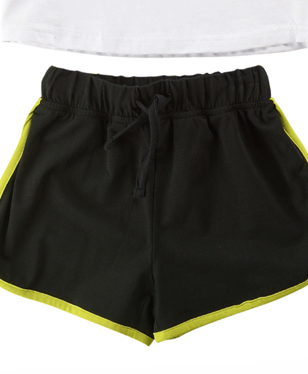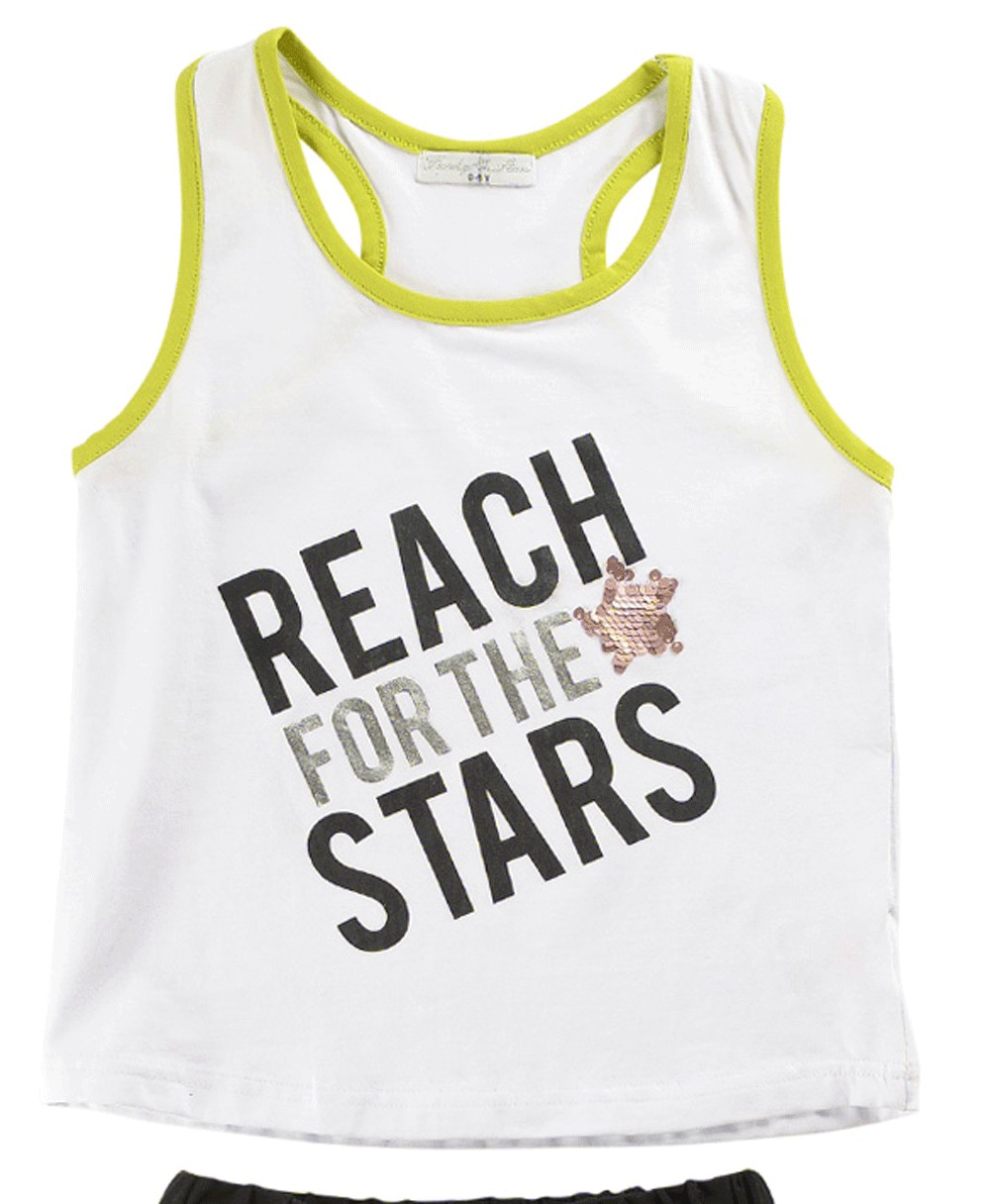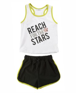 Σετ που αποτελείται από 2 κομμάτια: πάνω λευκή αμάνικη μπλούζα με γράμματα μπροστά, κάτω μαύρο σορτσάκι με κίτρινες λεπτομέρειες.