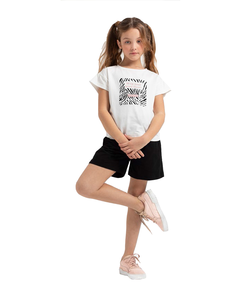 Σετ που αποτελείται από 2 κομμάτια: πάνω εκρού κοντομάνικη μπλούζα με σχέδιο μπροστά, κάτω μαύρο σορτάκι.