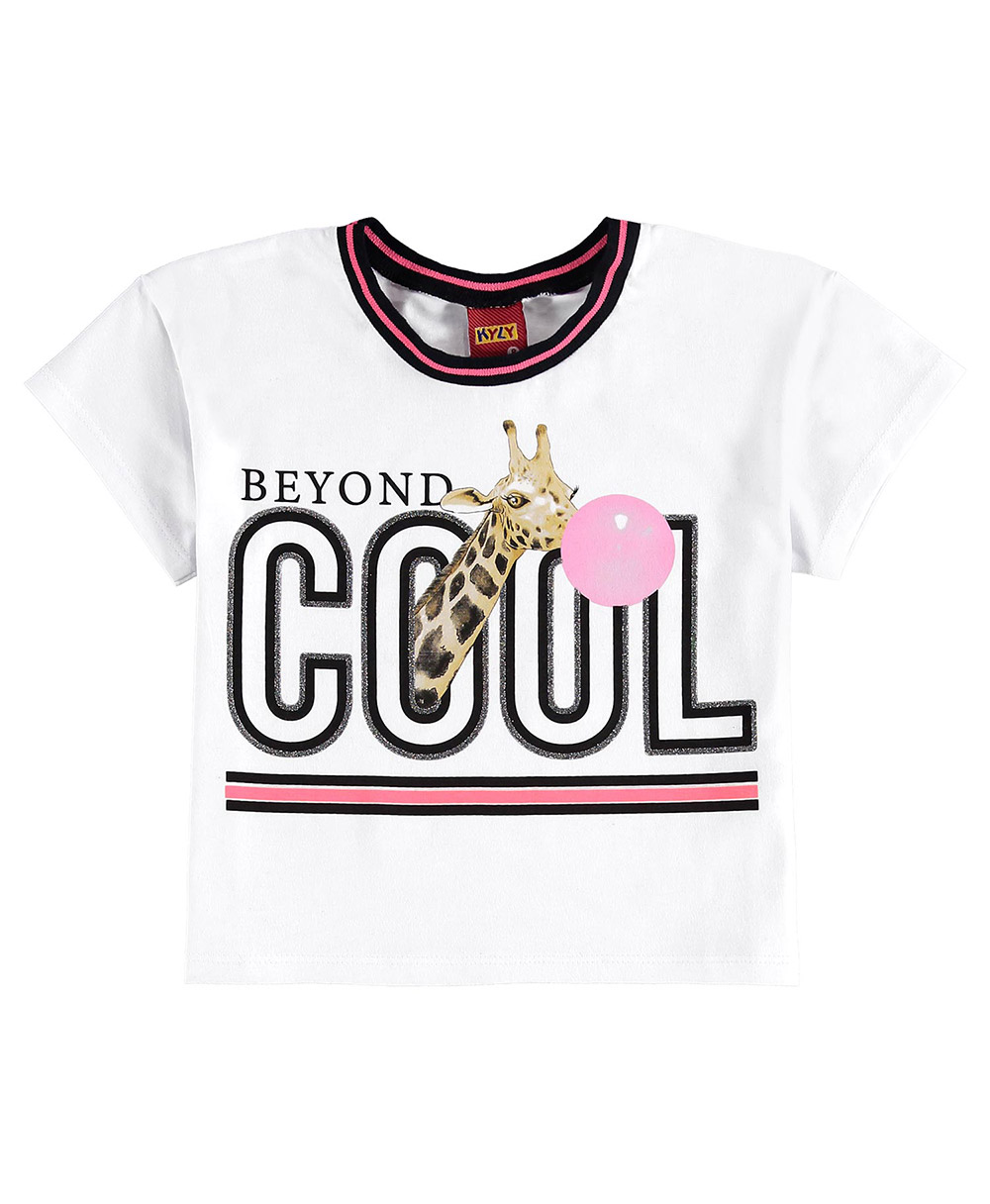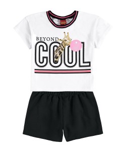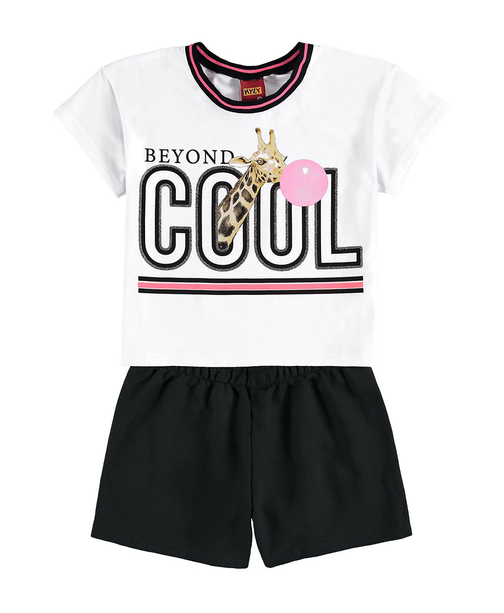 Σετ που αποτελείται από 2 κομμάτια: πάνω λευκή κοντομάνικη μπλούζα με γράμματα μπροστά, κάτω μαύρο σορτάκι.
