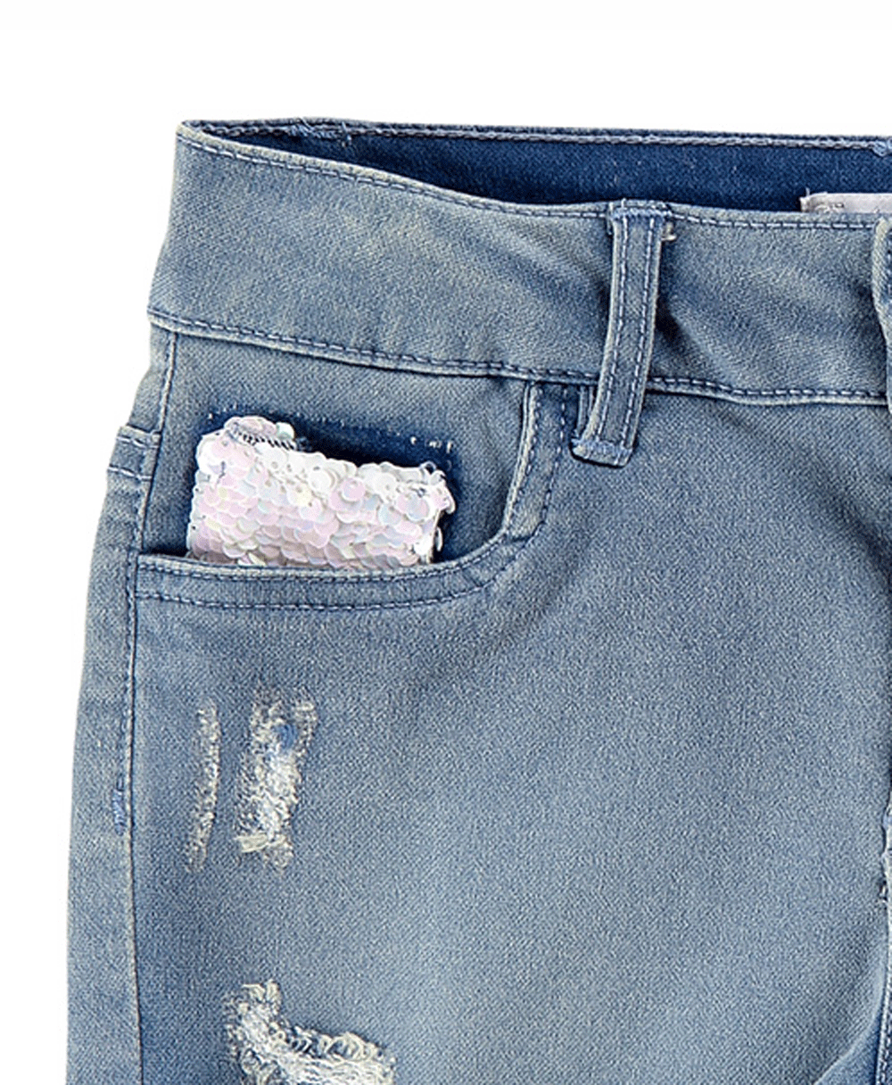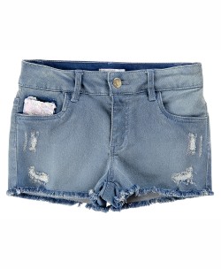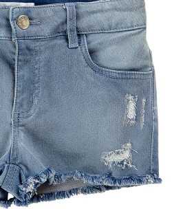 Σορτς τζιν με σκισίματα για μοντέρνα κορίτσια. Στην εσωτερική πλευρά της μέσης υπάρχει λάστιχο για αυξομείωση του μεγέθους.
