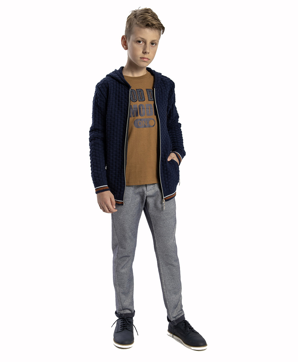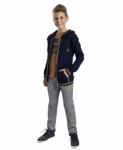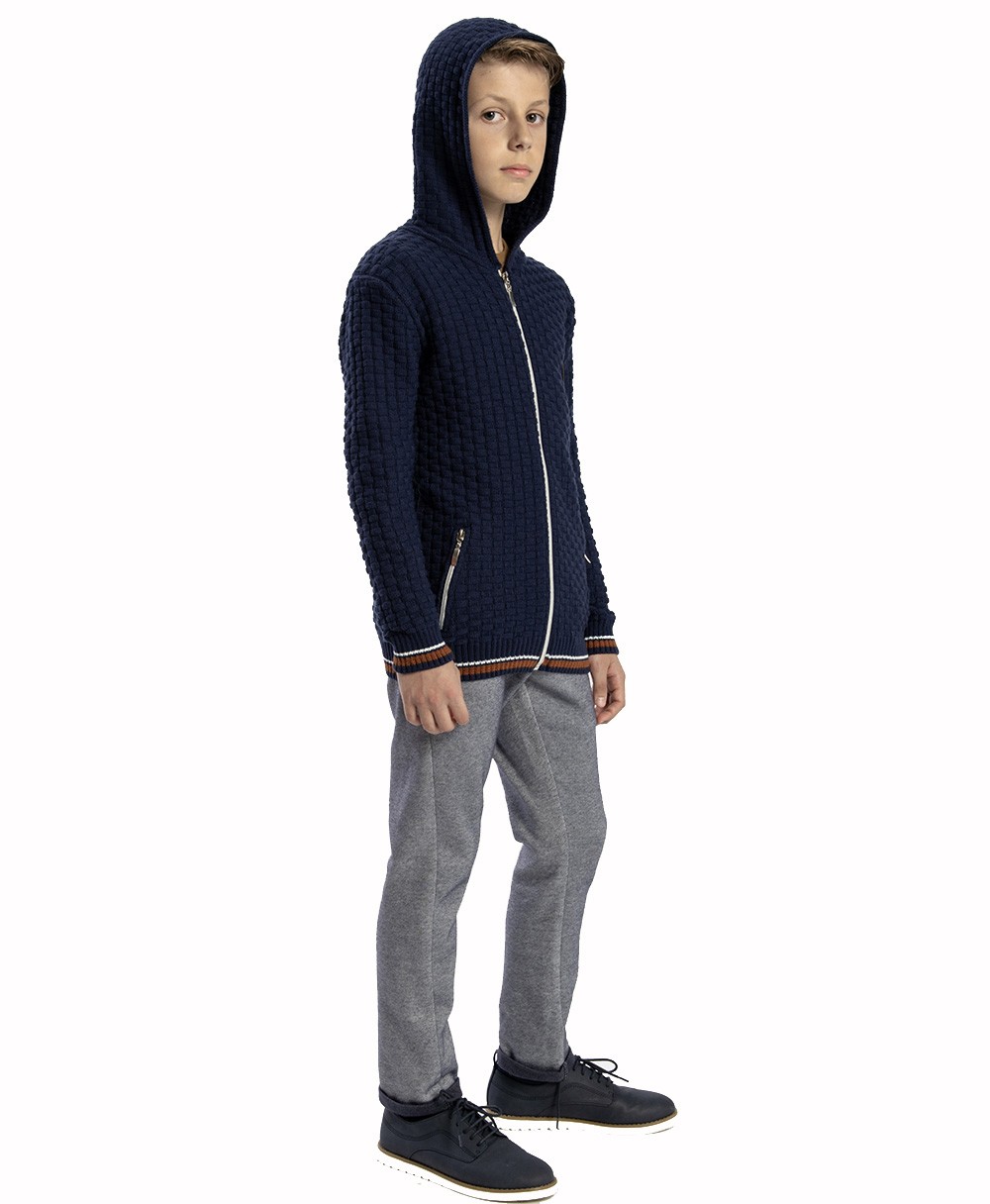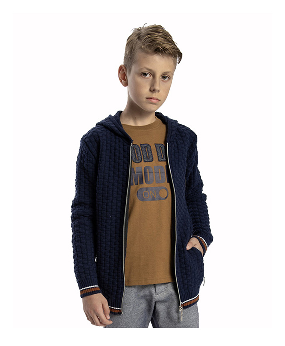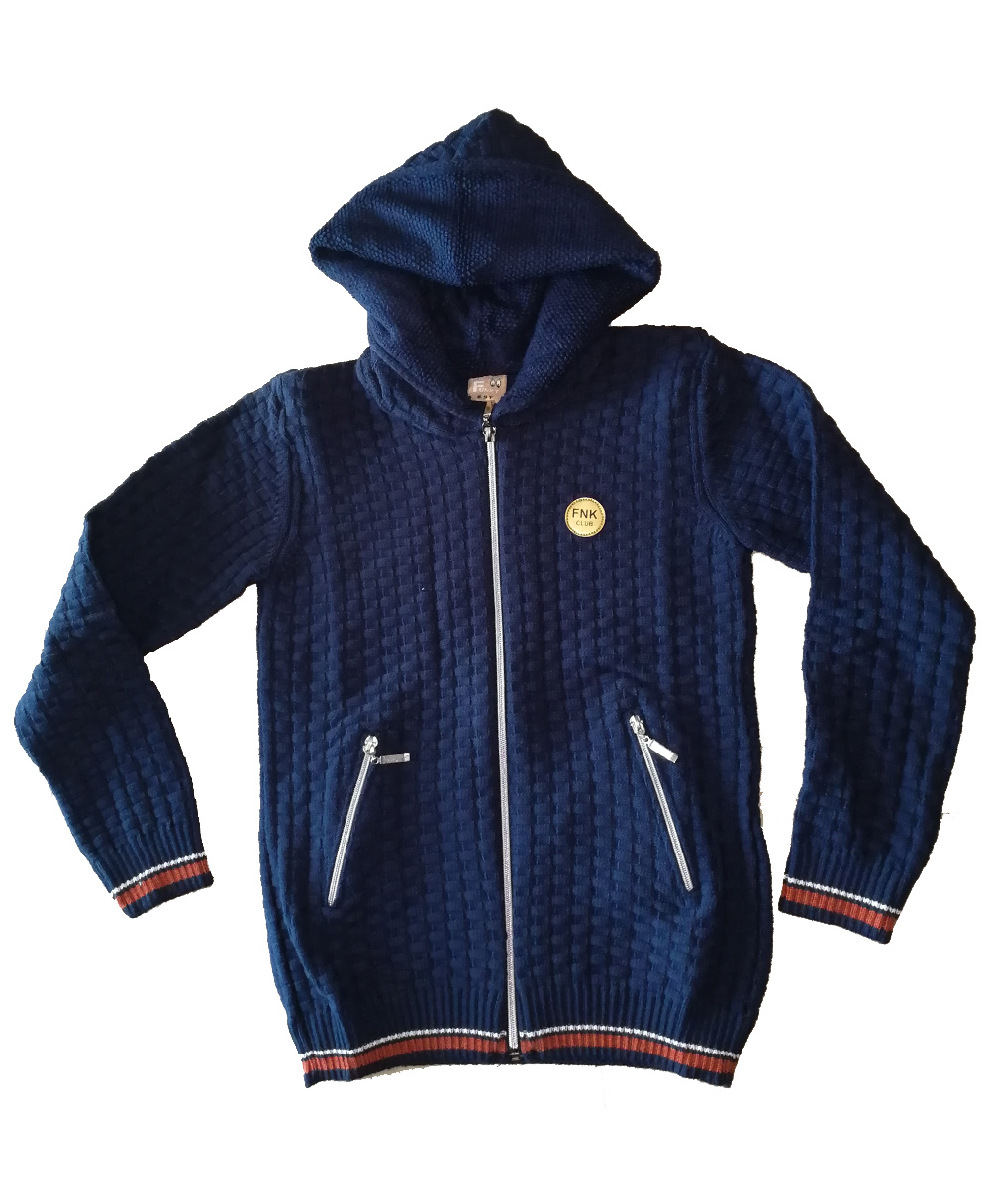 Ζακέτα πλεκτή για αγόρι σε μπλε χρώμα με κουκούλα. Κλείνει με φερμουάρ.